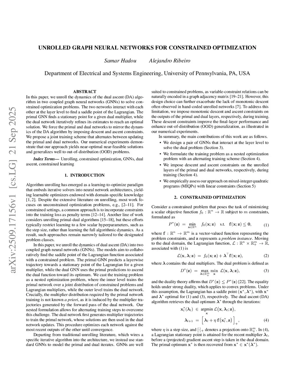 In this paper, we unroll the dynamics of the dual ascent (DA) algorithm in two coupled graph neural networks (GNNs) to solve constrained optimization problems. The two networks interact with each other at the layer level to find a saddle point of the Lagrangian. The primal GNN finds a stationary point for a given dual multiplier, while the dual network iteratively refines its estimates to reach an optimal solution. We force the primal and dual networks to mirror the dynamics of the DA algorithm by imposing descent and ascent constraints. We propose a joint training scheme that alternates between updating the primal and dual networks. Our numerical experiments demonstrate that our approach yields near-optimal near-feasible solutions and generalizes well to out-of-distribution (OOD) problems.