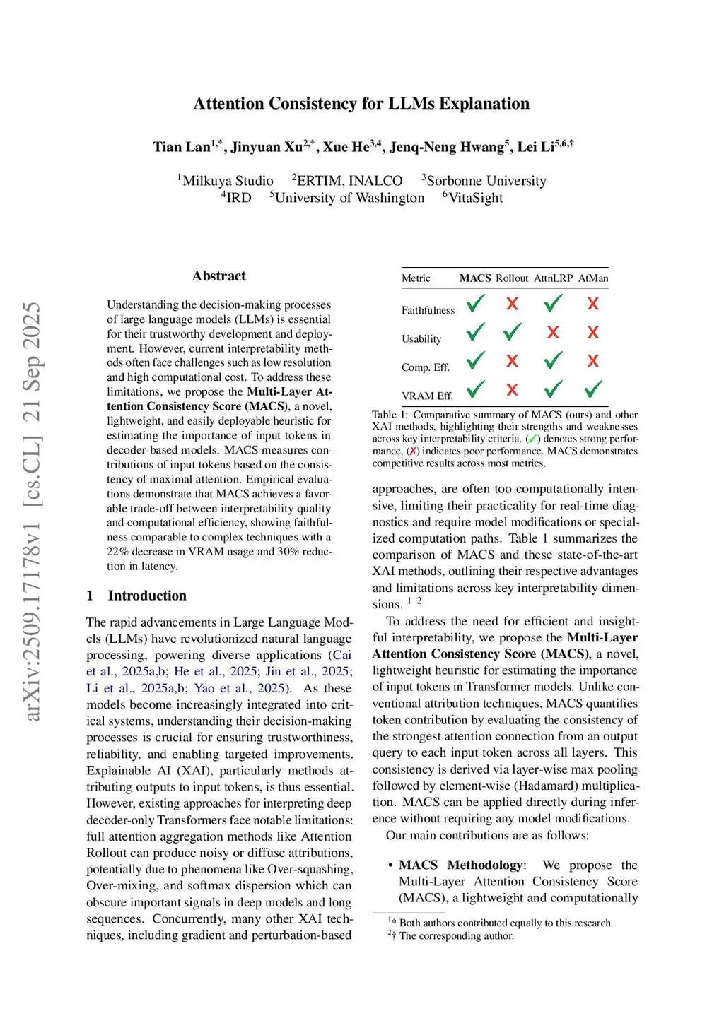 Understanding the decision-making processes of large language models (LLMs) is essential for their trustworthy development and deployment. However, current interpretability methods often face challenges such as low resolution and high computational cost. To address these limitations, we propose the \textbf{Multi-Layer Attention Consistency Score (MACS)}, a novel, lightweight, and easily deployable heuristic for estimating the importance of input tokens in decoder-based models. MACS measures contributions of input tokens based on the consistency of maximal attention. Empirical evaluations demonstrate that MACS achieves a favorable trade-off between interpretability quality and computational efficiency, showing faithfulness comparable to complex techniques with a 22\% decrease in VRAM usage and 30\% reduction in latency.