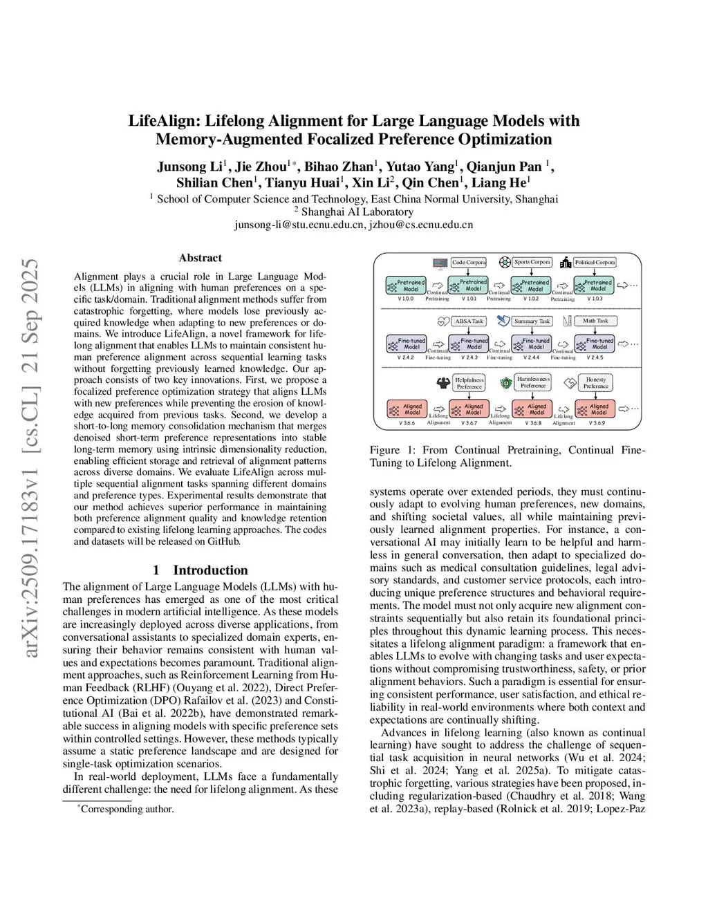 Alignment plays a crucial role in Large Language Models (LLMs) in aligning with human preferences on a specific task/domain. Traditional alignment methods suffer from catastrophic forgetting, where models lose previously acquired knowledge when adapting to new preferences or domains. We introduce LifeAlign, a novel framework for lifelong alignment that enables LLMs to maintain consistent human preference alignment across sequential learning tasks without forgetting previously learned knowledge. Our approach consists of two key innovations. First, we propose a focalized preference optimization strategy that aligns LLMs with new preferences while preventing the erosion of knowledge acquired from previous tasks. Second, we develop a short-to-long memory consolidation mechanism that merges denoised short-term preference representations into stable long-term memory using intrinsic dimensionality reduction, enabling efficient storage and retrieval of alignment patterns across diverse domains. We evaluate LifeAlign across multiple sequential alignment tasks spanning different domains and preference types. Experimental results demonstrate that our method achieves superior performance in maintaining both preference alignment quality and knowledge retention compared to existing lifelong learning approaches. The codes and datasets will be released on GitHub.