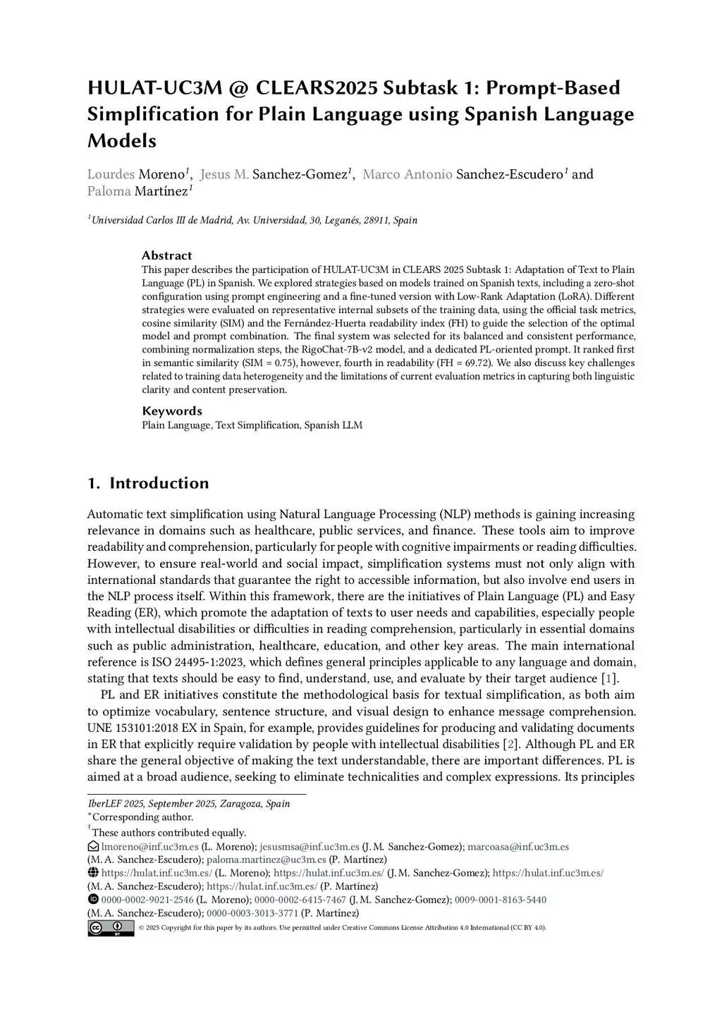 This paper describes the participation of HULAT-UC3M in CLEARS 2025 Subtask 1: Adaptation of Text to Plain Language (PL) in Spanish. We explored strategies based on models trained on Spanish texts, including a zero-shot configuration using prompt engineering and a fine-tuned version with Low-Rank Adaptation (LoRA). Different strategies were evaluated on representative internal subsets of the training data, using the official task metrics, cosine similarity (SIM) and the Fernández-Huerta readability index (FH) to guide the selection of the optimal model and prompt combination. The final system was selected for its balanced and consistent performance, combining normalization steps, the RigoChat-7B-v2 model, and a dedicated PL-oriented prompt. It ranked first in semantic similarity (SIM = 0.75), however, fourth in readability (FH = 69.72). We also discuss key challenges related to training data heterogeneity and the limitations of current evaluation metrics in capturing both linguistic clarity and content preservation.