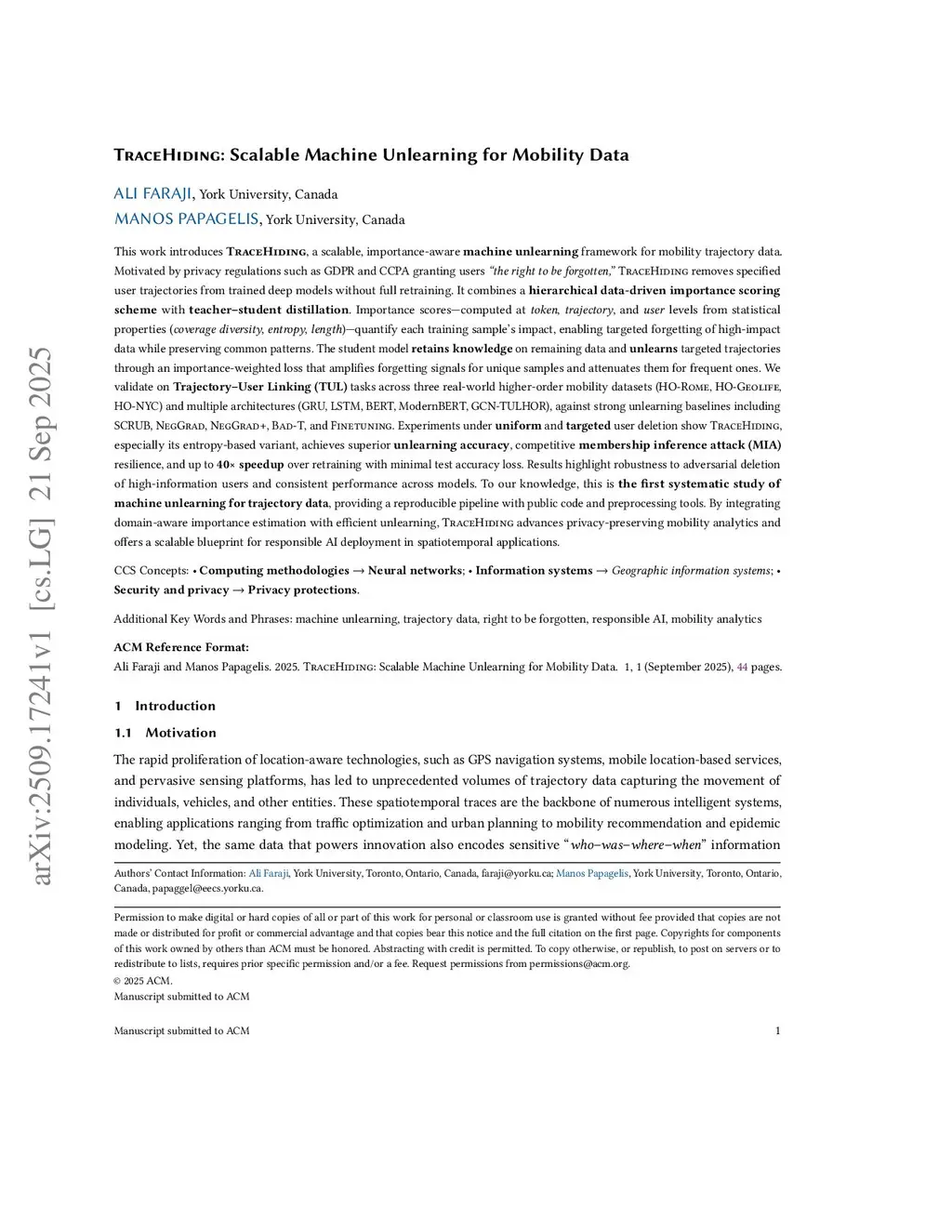 TraceHiding: Scalable Machine Unlearning for Mobility Data