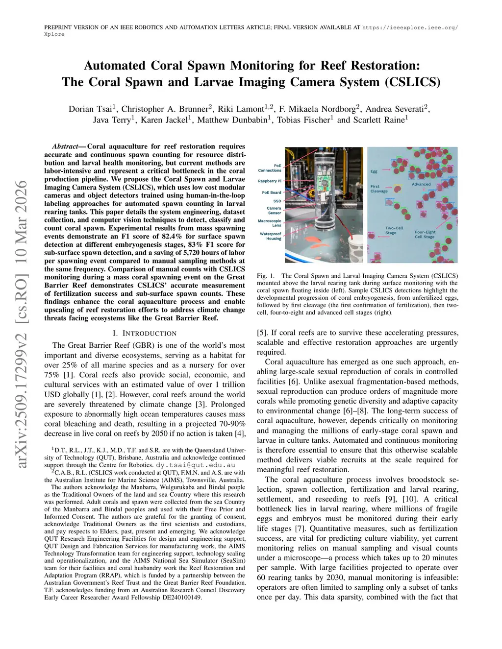 Coral aquaculture for reef restoration requires accurate and continuous spawn counting for resource distribution and larval health monitoring, but current methods are labor-intensive and represent a critical bottleneck in the coral production pipeline. We propose the Coral Spawn and Larvae Imaging Camera System (CSLICS), which uses low cost modular cameras and object detectors trained using human-in-the-loop labeling approaches for automated spawn counting in larval rearing tanks. This paper details the system engineering, dataset collection, and computer vision techniques to detect, classify and count coral spawn. Experimental results from mass spawning events demonstrate an F1 score of 82.4% for surface spawn detection at different embryogenesis stages, 65.3% F1 score for sub-surface spawn detection, and a saving of 5,720 hours of labor per spawning event compared to manual sampling methods at the same frequency. Comparison of manual counts with CSLICS monitoring during a mass coral spawning event on the Great Barrier Reef demonstrates CSLICS' accurate measurement of fertilization success and sub-surface spawn counts. These findings enhance the coral aquaculture process and enable upscaling of coral reef restoration efforts to address climate change threats facing ecosystems like the Great Barrier Reef.