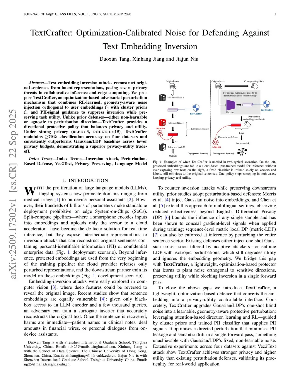 Text embedding inversion attacks reconstruct original sentences from latent representations, posing severe privacy threats in collaborative inference and edge computing. We propose TextCrafter, an optimization-based adversarial perturbation mechanism that combines RL learned, geometry aware noise injection orthogonal to user embeddings with cluster priors and PII signal guidance to suppress inversion while preserving task utility. Unlike prior defenses either non learnable or agnostic to perturbation direction, TextCrafter provides a directional protective policy that balances privacy and utility. Under strong privacy setting, TextCrafter maintains 70 percentage classification accuracy on four datasets and consistently outperforms Gaussian/LDP baselines across lower privacy budgets, demonstrating a superior privacy utility trade off.
