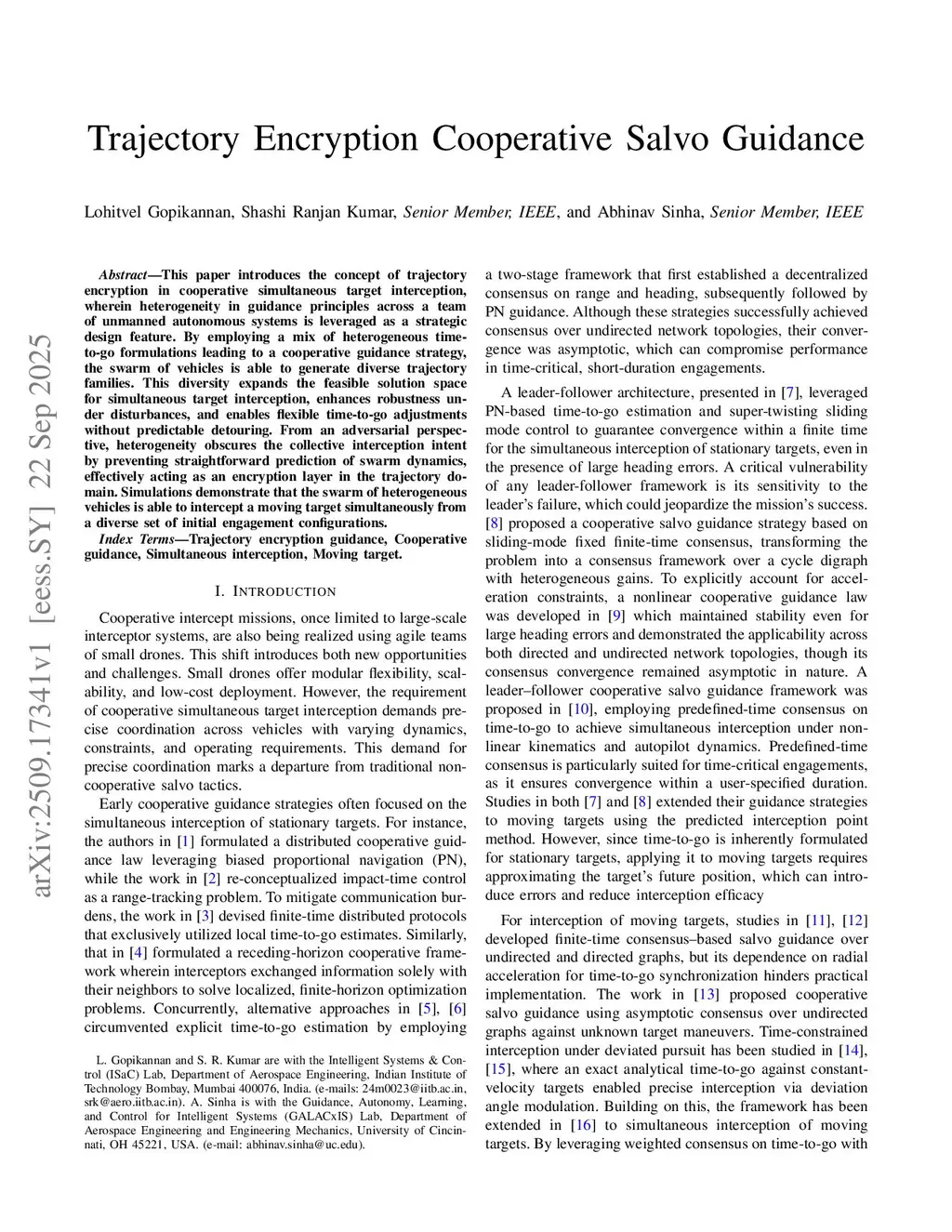 This paper introduces the concept of trajectory encryption in cooperative simultaneous target interception, wherein heterogeneity in guidance principles across a team of unmanned autonomous systems is leveraged as a strategic design feature. By employing a mix of heterogeneous time-to-go formulations leading to a cooperative guidance strategy, the swarm of vehicles is able to generate diverse trajectory families. This diversity expands the feasible solution space for simultaneous target interception, enhances robustness under disturbances, and enables flexible time-to-go adjustments without predictable detouring. From an adversarial perspective, heterogeneity obscures the collective interception intent by preventing straightforward prediction of swarm dynamics, effectively acting as an encryption layer in the trajectory domain. Simulations demonstrate that the swarm of heterogeneous vehicles is able to intercept a moving target simultaneously from a diverse set of initial engagement configurations.