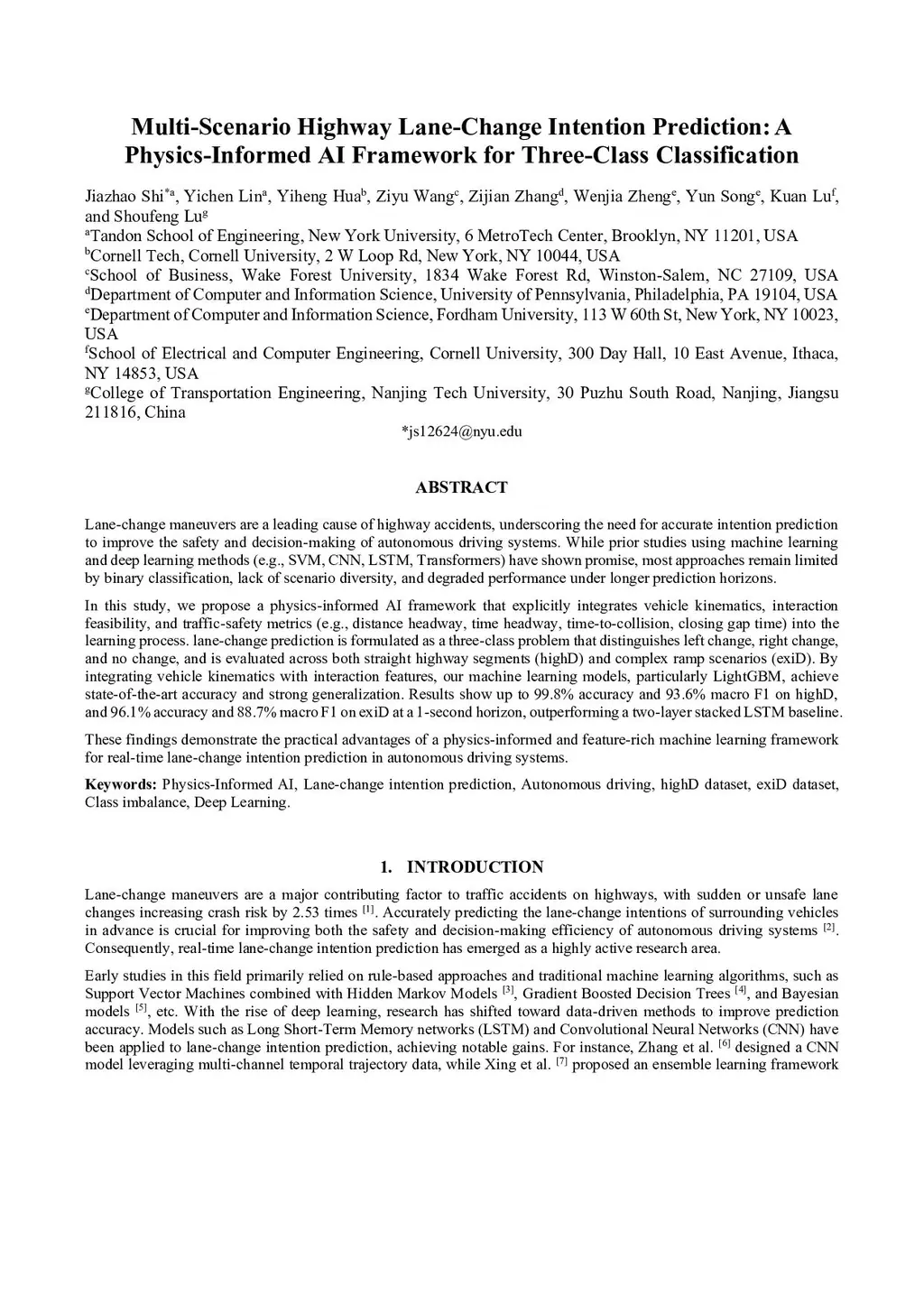 Multi-Scenario Highway Lane-Change Intention Prediction: A Physics-Informed AI Framework for Three-Class Classification