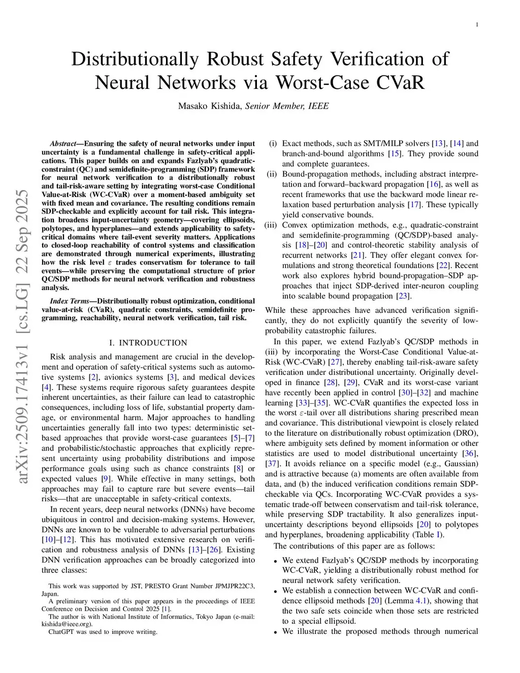 Ensuring the safety of neural networks under input uncertainty is a fundamental challenge in safety-critical applications. This paper builds on and expands Fazlyab's quadratic-constraint (QC) and semidefinite-programming (SDP) framework for neural network verification to a distributionally robust and tail-risk-aware setting by integrating worst-case Conditional Value-at-Risk (WC-CVaR) over a moment-based ambiguity set with fixed mean and covariance. The resulting conditions remain SDP-checkable and explicitly account for tail risk. This integration broadens input-uncertainty geometry-covering ellipsoids, polytopes, and hyperplanes-and extends applicability to safety-critical domains where tail-event severity matters. Applications to closed-loop reachability of control systems and classification are demonstrated through numerical experiments, illustrating how the risk level trades conservatism for tolerance to tail events-while preserving the computational structure of prior QC/SDP methods for neural network verification and robustness analysis.