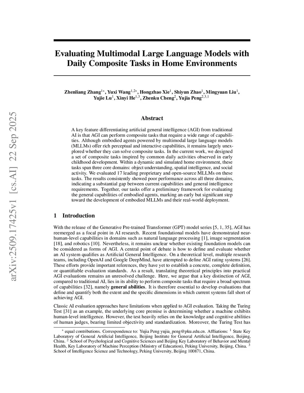 A key feature differentiating artificial general intelligence (AGI) from traditional AI is that AGI can perform composite tasks that require a wide range of capabilities. Although embodied agents powered by multimodal large language models (MLLMs) offer rich perceptual and interactive capabilities, it remains largely unexplored whether they can solve composite tasks. In the current work, we designed a set of composite tasks inspired by common daily activities observed in early childhood development. Within a dynamic and simulated home environment, these tasks span three core domains: object understanding, spatial intelligence, and social activity. We evaluated 17 leading proprietary and open-source MLLMs on these tasks. The results consistently showed poor performance across all three domains, indicating a substantial gap between current capabilities and general intelligence requirements. Together, our tasks offer a preliminary framework for evaluating the general capabilities of embodied agents, marking an early but significant step toward the development of embodied MLLMs and their real-world deployment.
