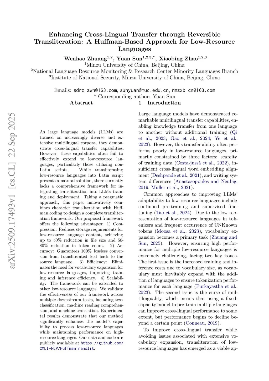 As large language models (LLMs) are trained on increasingly diverse and extensive multilingual corpora, they demonstrate cross-lingual transfer capabilities. However, these capabilities often fail to effectively extend to low-resource languages, particularly those utilizing non-Latin scripts. While transliterating low-resource languages into Latin script presents a natural solution, there currently lacks a comprehensive framework for integrating transliteration into LLMs training and deployment. Taking a pragmatic approach, this paper innovatively combines character transliteration with Huffman coding to design a complete transliteration framework. Our proposed framework offers the following advantages: 1) Compression: Reduces storage requirements for low-resource language content, achieving up to 50% reduction in file size and 50-80% reduction in token count. 2) Accuracy: Guarantees 100% lossless conversion from transliterated text back to the source language. 3) Efficiency: Eliminates the need for vocabulary expansion for low-resource languages, improving training and inference efficiency. 4) Scalability: The framework can be extended to other low-resource languages. We validate the effectiveness of our framework across multiple downstream tasks, including text classification, machine reading comprehension, and machine translation. Experimental results demonstrate that our method significantly enhances the model's capability to process low-resource languages while maintaining performance on high-resource languages. Our data and code are publicly available atthis https URL.