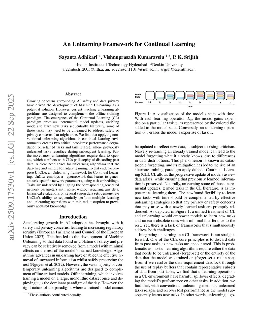 Growing concerns surrounding AI safety and data privacy have driven the development of Machine Unlearning as a potential solution. However, current machine unlearning algorithms are designed to complement the offline training paradigm. The emergence of the Continual Learning (CL) paradigm promises incremental model updates, enabling models to learn new tasks sequentially. Naturally, some of those tasks may need to be unlearned to address safety or privacy concerns that might arise. We find that applying conventional unlearning algorithms in continual learning environments creates two critical problems: performance degradation on retained tasks and task relapse, where previously unlearned tasks resurface during subsequent learning. Furthermore, most unlearning algorithms require data to operate, which conflicts with CL's philosophy of discarding past data. A clear need arises for unlearning algorithms that are data-free and mindful of future learning. To that end, we propose UnCLe, an Unlearning framework for Continual Learning. UnCLe employs a hypernetwork that learns to generate task-specific network parameters, using task embeddings. Tasks are unlearned by aligning the corresponding generated network parameters with noise, without requiring any data. Empirical evaluations on several vision data sets demonstrate UnCLe's ability to sequentially perform multiple learning and unlearning operations with minimal disruption to previously acquired knowledge.