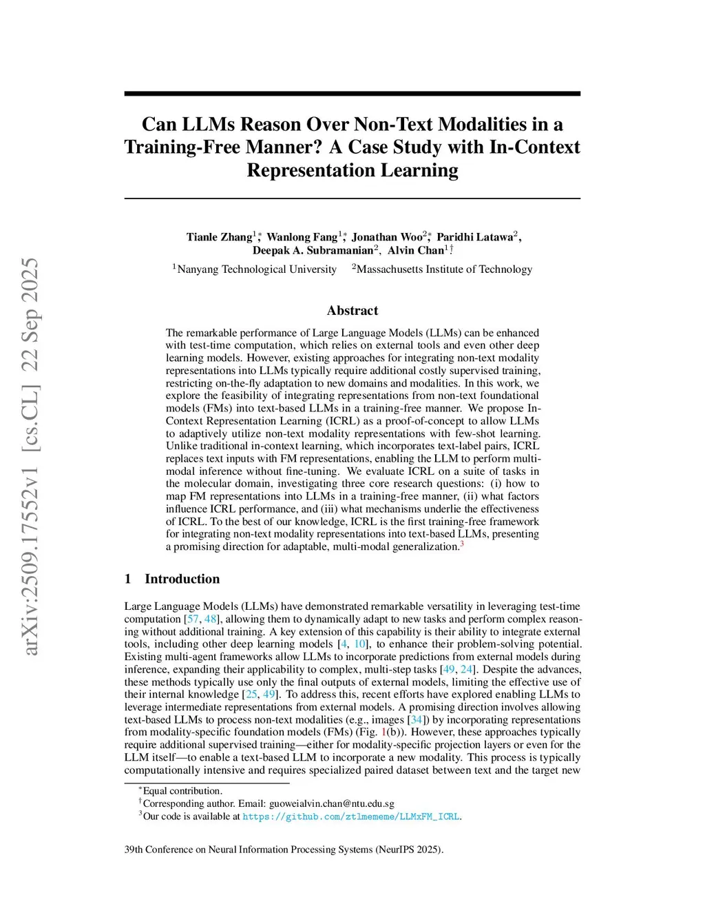 The remarkable performance of Large Language Models (LLMs) can be enhanced with test-time computation, which relies on external tools and even other deep learning models. However, existing approaches for integrating non-text modality representations into LLMs typically require additional costly supervised training, restricting on-the-fly adaptation to new domains and modalities. In this work, we explore the feasibility of integrating representations from non-text foundational models (FMs) into text-based LLMs in a training-free manner. We propose In-Context Representation Learning (ICRL) as a proof-of-concept to allow LLMs to adaptively utilize non-text modality representations with few-shot learning. Unlike traditional in-context learning, which incorporates text-label pairs, ICRL replaces text inputs with FM representations, enabling the LLM to perform multi-modal inference without fine-tuning. We evaluate ICRL on a suite of tasks in the molecular domain, investigating three core research questions: (i) how to map FM representations into LLMs in a training-free manner, (ii) what factors influence ICRL performance, and (iii) what mechanisms underlie the effectiveness of ICRL. To the best of our knowledge, ICRL is the first training-free framework for integrating non-text modality representations into text-based LLMs, presenting a promising direction for adaptable, multi-modal generalization.