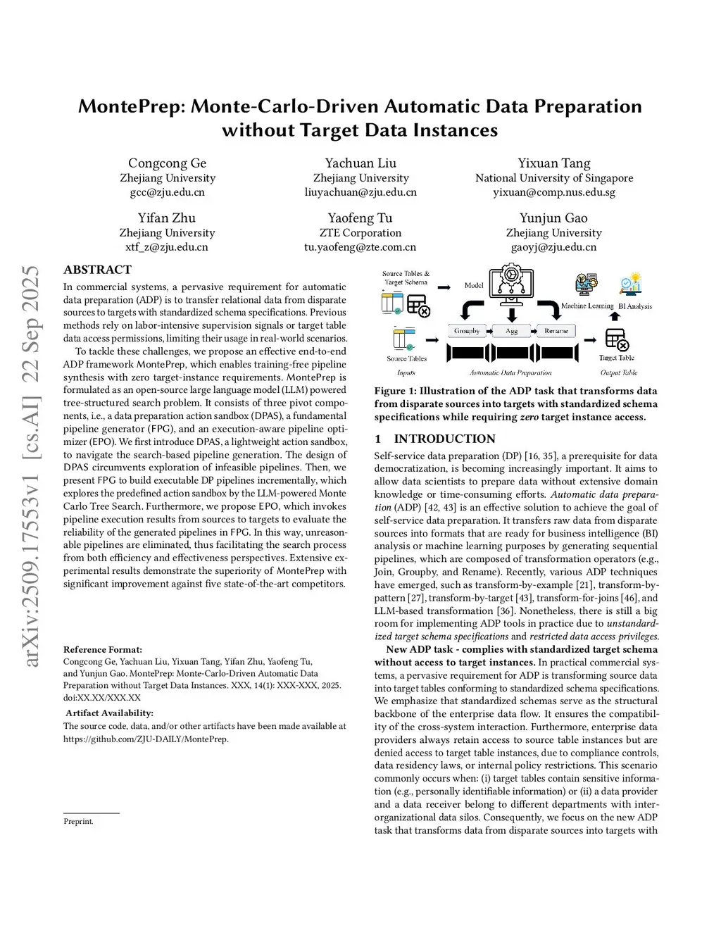 In commercial systems, a pervasive requirement for automatic data preparation (ADP) is to transfer relational data from disparate sources to targets with standardized schema specifications. Previous methods rely on labor-intensive supervision signals or target table data access permissions, limiting their usage in real-world scenarios. To tackle these challenges, we propose an effective end-to-end ADP framework MontePrep, which enables training-free pipeline synthesis with zero target-instance requirements. MontePrep is formulated as an open-source large language model (LLM) powered tree-structured search problem. It consists of three pivot components, i.e., a data preparation action sandbox (DPAS), a fundamental pipeline generator (FPG), and an execution-aware pipeline optimizer (EPO). We first introduce DPAS, a lightweight action sandbox, to navigate the search-based pipeline generation. The design of DPAS circumvents exploration of infeasible pipelines. Then, we present FPG to build executable DP pipelines incrementally, which explores the predefined action sandbox by the LLM-powered Monte Carlo Tree Search. Furthermore, we propose EPO, which invokes pipeline execution results from sources to targets to evaluate the reliability of the generated pipelines in FPG. In this way, unreasonable pipelines are eliminated, thus facilitating the search process from both efficiency and effectiveness perspectives. Extensive experimental results demonstrate the superiority of MontePrep with significant improvement against five state-of-the-art competitors.