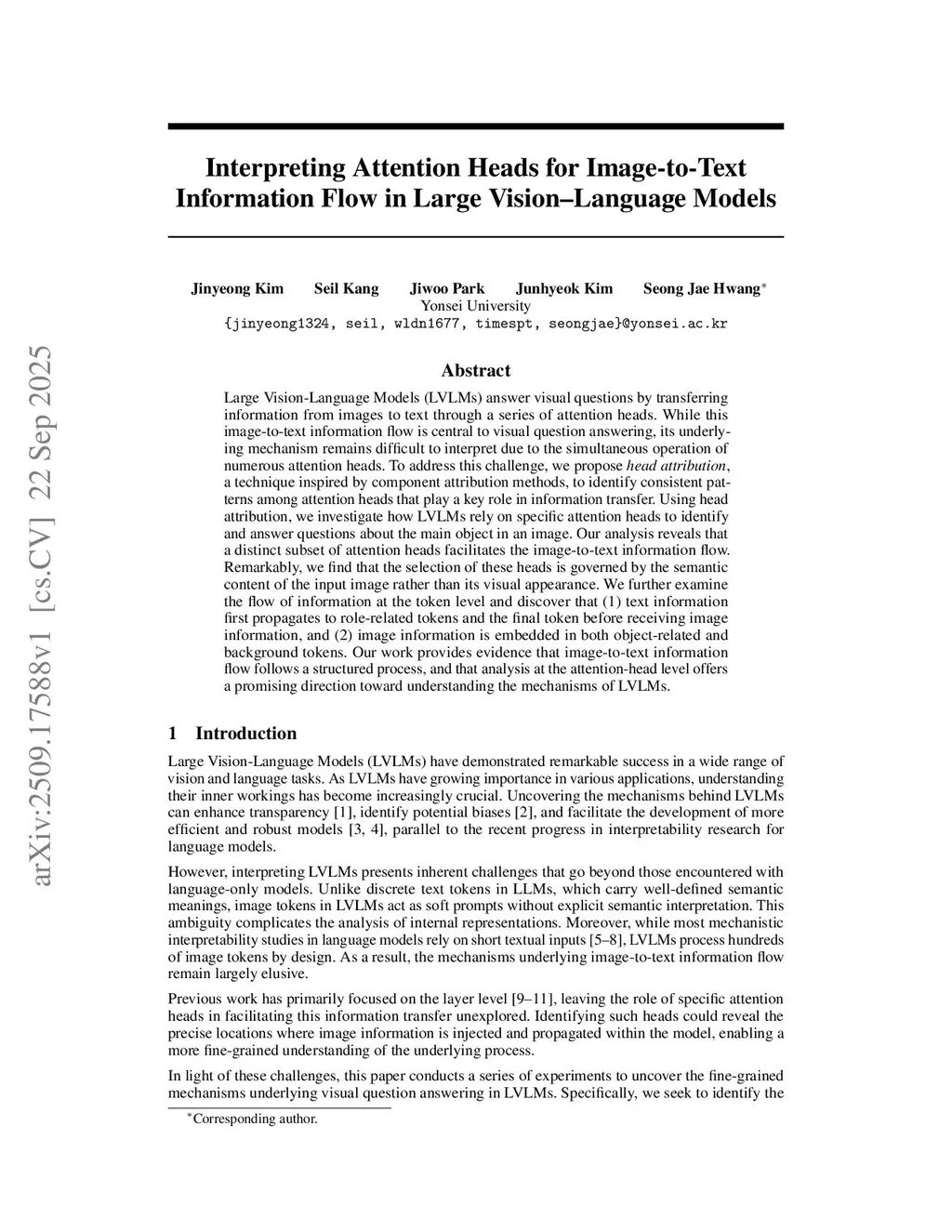 Large Vision-Language Models (LVLMs) answer visual questions by transferring information from images to text through a series of attention heads. While this image-to-text information flow is central to visual question answering, its underlying mechanism remains difficult to interpret due to the simultaneous operation of numerous attention heads. To address this challenge, we propose head attribution, a technique inspired by component attribution methods, to identify consistent patterns among attention heads that play a key role in information transfer. Using head attribution, we investigate how LVLMs rely on specific attention heads to identify and answer questions about the main object in an image. Our analysis reveals that a distinct subset of attention heads facilitates the image-to-text information flow. Remarkably, we find that the selection of these heads is governed by the semantic content of the input image rather than its visual appearance. We further examine the flow of information at the token level and discover that (1) text information first propagates to role-related tokens and the final token before receiving image information, and (2) image information is embedded in both object-related and background tokens. Our work provides evidence that image-to-text information flow follows a structured process, and that analysis at the attention-head level offers a promising direction toward understanding the mechanisms of LVLMs.