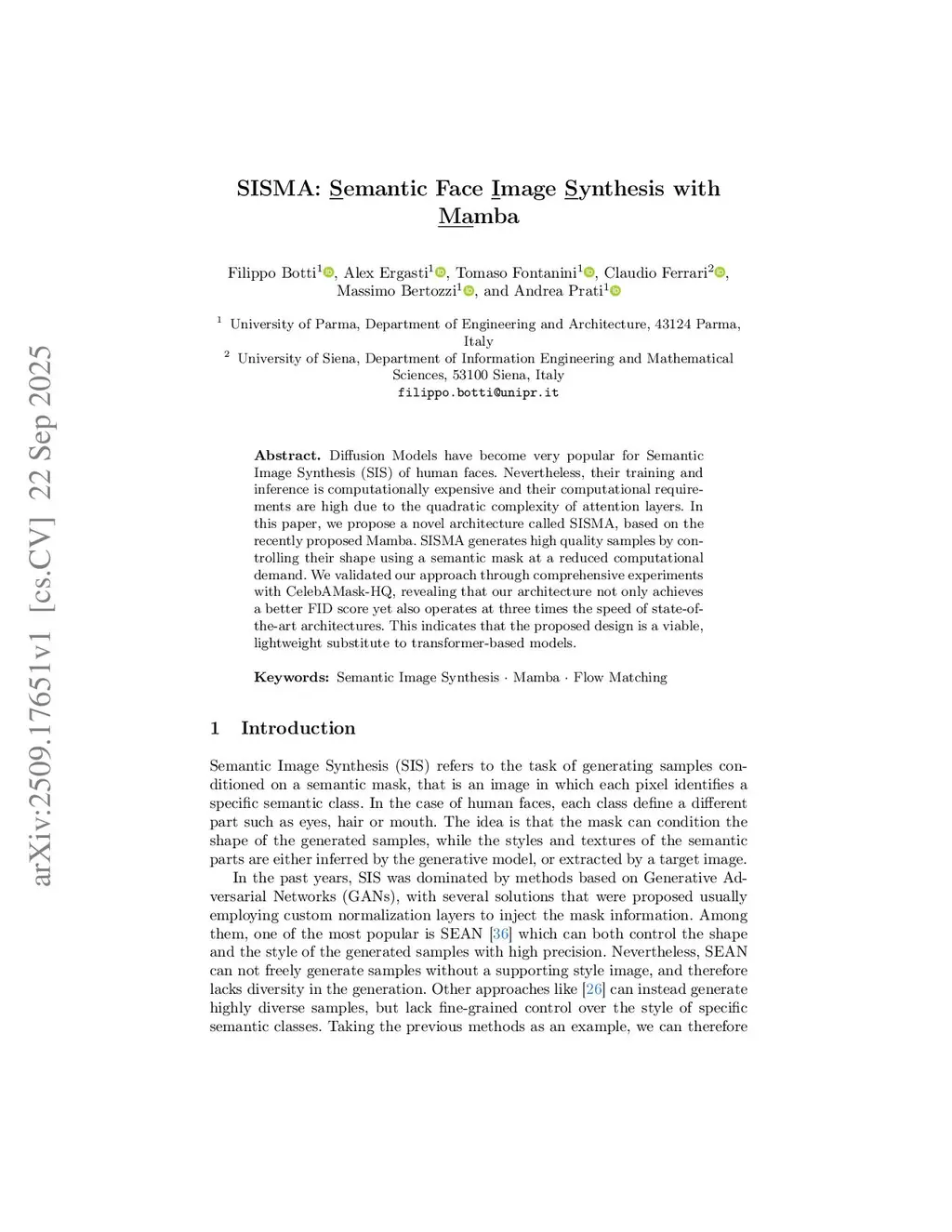 Diffusion Models have become very popular for Semantic Image Synthesis (SIS) of human faces. Nevertheless, their training and inference is computationally expensive and their computational requirements are high due to the quadratic complexity of attention layers. In this paper, we propose a novel architecture called SISMA, based on the recently proposed Mamba. SISMA generates high quality samples by controlling their shape using a semantic mask at a reduced computational demand. We validated our approach through comprehensive experiments with CelebAMask-HQ, revealing that our architecture not only achieves a better FID score yet also operates at three times the speed of state-of-the-art architectures. This indicates that the proposed design is a viable, lightweight substitute to transformer-based models.