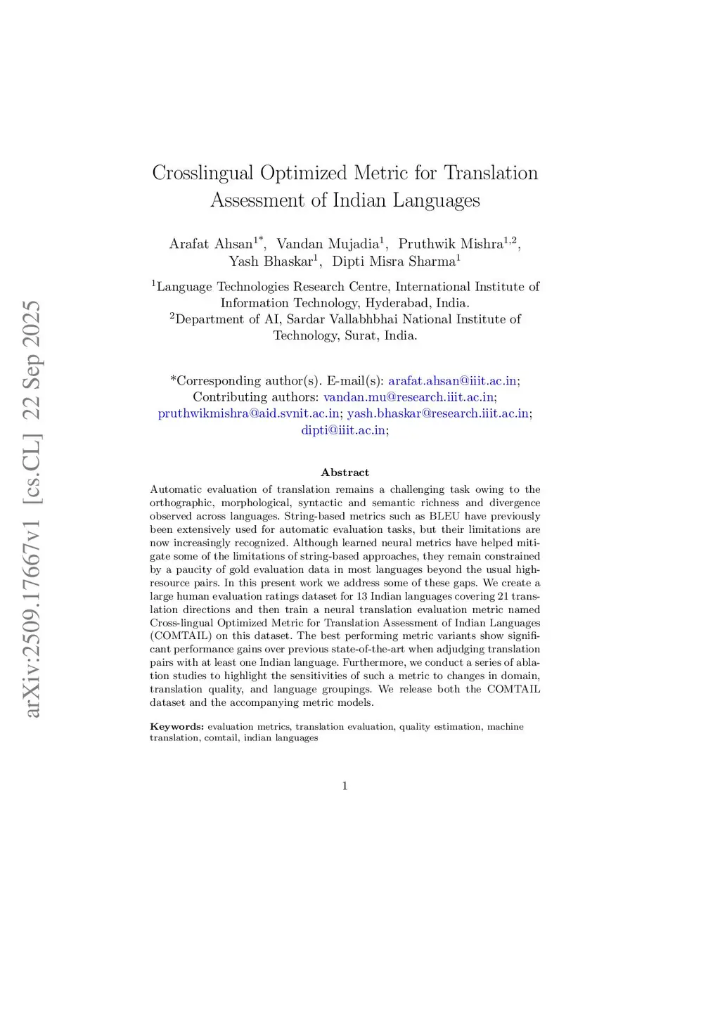 Automatic evaluation of translation remains a challenging task owing to the orthographic, morphological, syntactic and semantic richness and divergence observed across languages. String-based metrics such as BLEU have previously been extensively used for automatic evaluation tasks, but their limitations are now increasingly recognized. Although learned neural metrics have helped mitigate some of the limitations of string-based approaches, they remain constrained by a paucity of gold evaluation data in most languages beyond the usual high-resource pairs. In this present work we address some of these gaps. We create a large human evaluation ratings dataset for 13 Indian languages covering 21 translation directions and then train a neural translation evaluation metric named Cross-lingual Optimized Metric for Translation Assessment of Indian Languages (COMTAIL) on this dataset. The best performing metric variants show significant performance gains over previous state-of-the-art when adjudging translation pairs with at least one Indian language. Furthermore, we conduct a series of ablation studies to highlight the sensitivities of such a metric to changes in domain, translation quality, and language groupings. We release both the COMTAIL dataset and the accompanying metric models.