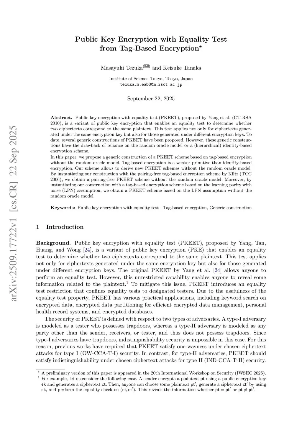 Public Key Encryption with Equality Test from Tag-Based Encryption