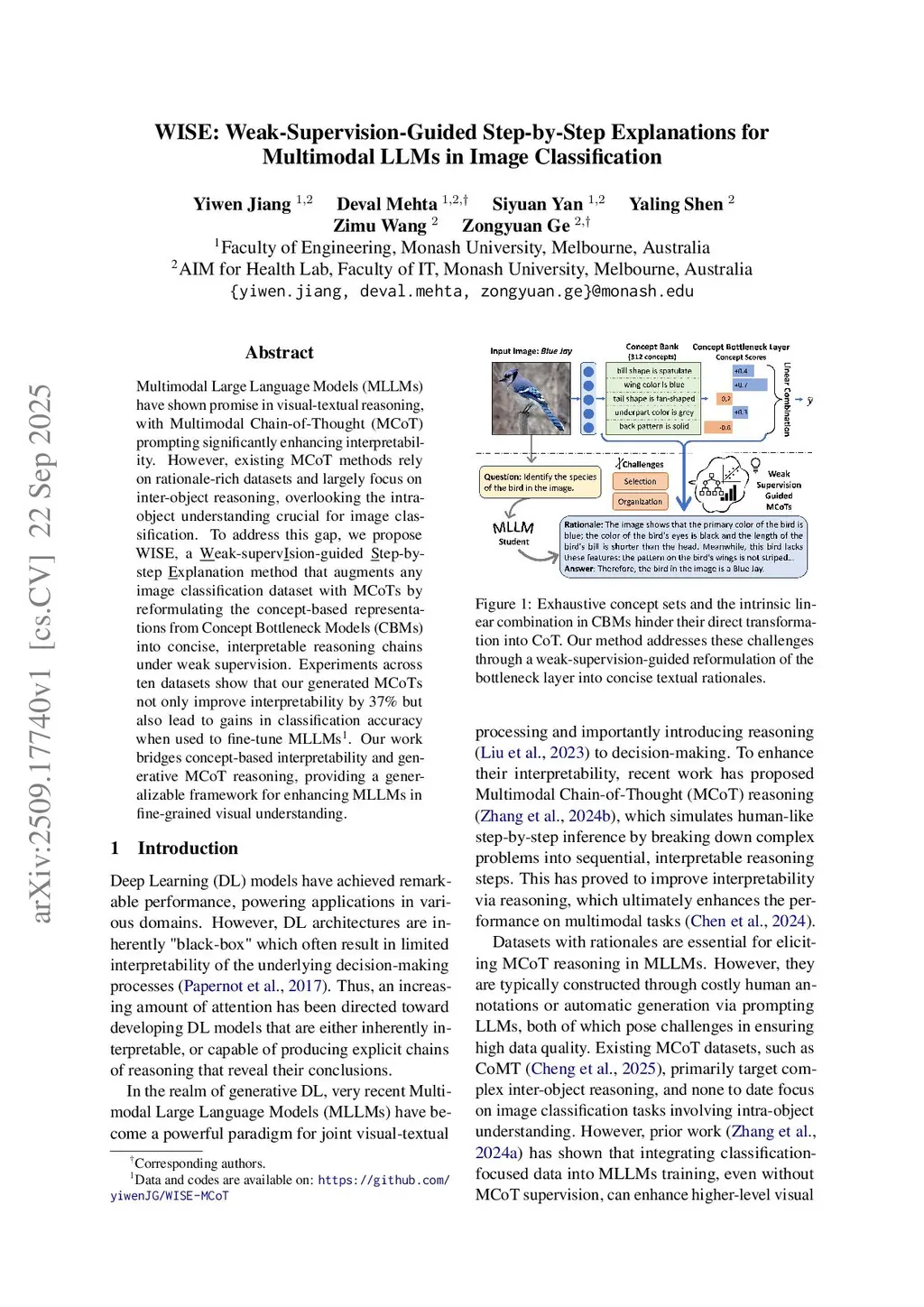 Multimodal Large Language Models (MLLMs) have shown promise in visual-textual reasoning, with Multimodal Chain-of-Thought (MCoT) prompting significantly enhancing interpretability. However, existing MCoT methods rely on rationale-rich datasets and largely focus on inter-object reasoning, overlooking the intra-object understanding crucial for image classification. To address this gap, we propose WISE, a Weak-supervision-guided Step-by-step Explanation method that augments any image classification dataset with MCoTs by reformulating the concept-based representations from Concept Bottleneck Models (CBMs) into concise, interpretable reasoning chains under weak supervision. Experiments across ten datasets show that our generated MCoTs not only improve interpretability by 37% but also lead to gains in classification accuracy when used to fine-tune MLLMs. Our work bridges concept-based interpretability and generative MCoT reasoning, providing a generalizable framework for enhancing MLLMs in fine-grained visual understanding.