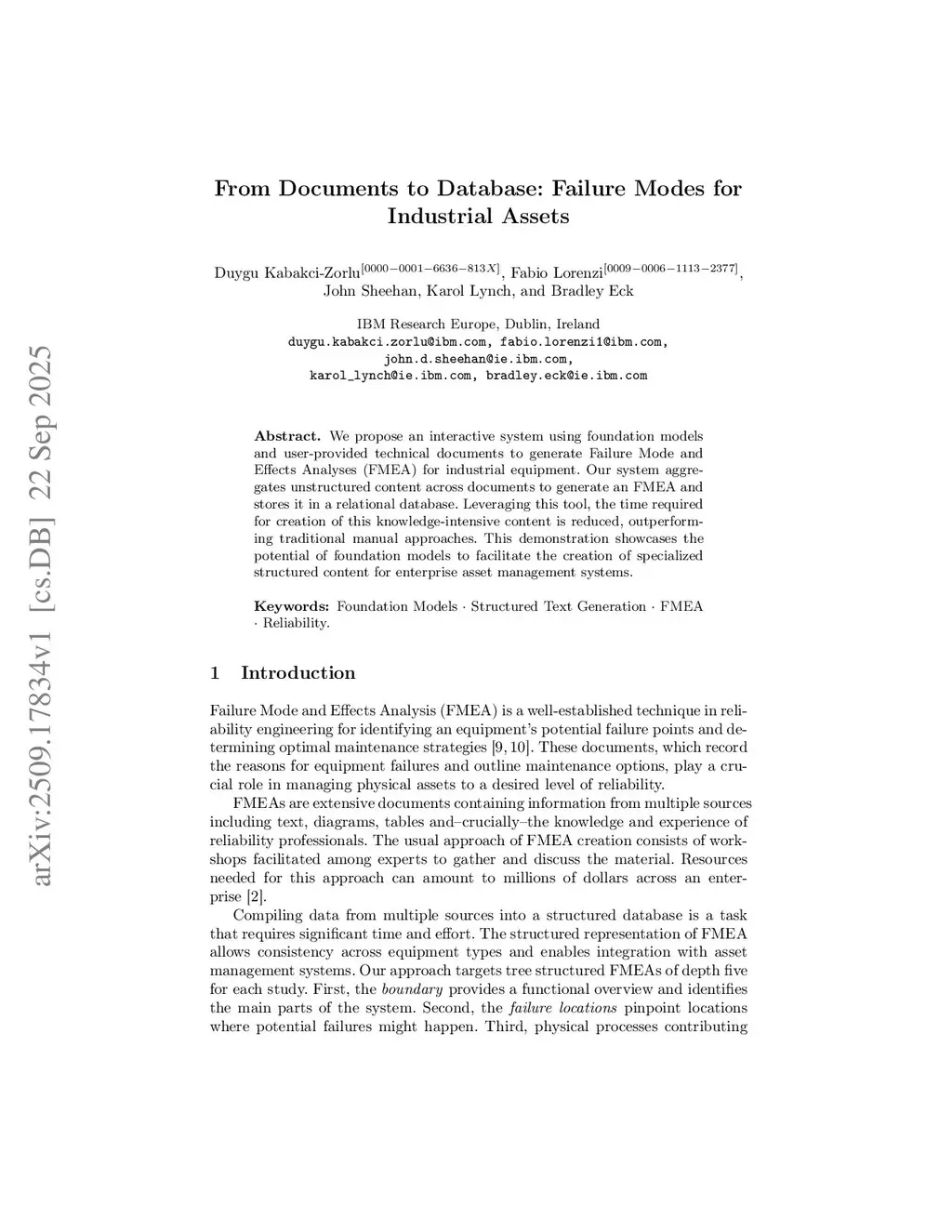 We propose an interactive system using foundation models and user-provided technical documents to generate Failure Mode and Effects Analyses (FMEA) for industrial equipment. Our system aggregates unstructured content across documents to generate an FMEA and stores it in a relational database. Leveraging this tool, the time required for creation of this knowledge-intensive content is reduced, outperforming traditional manual approaches. This demonstration showcases the potential of foundation models to facilitate the creation of specialized structured content for enterprise asset management systems.