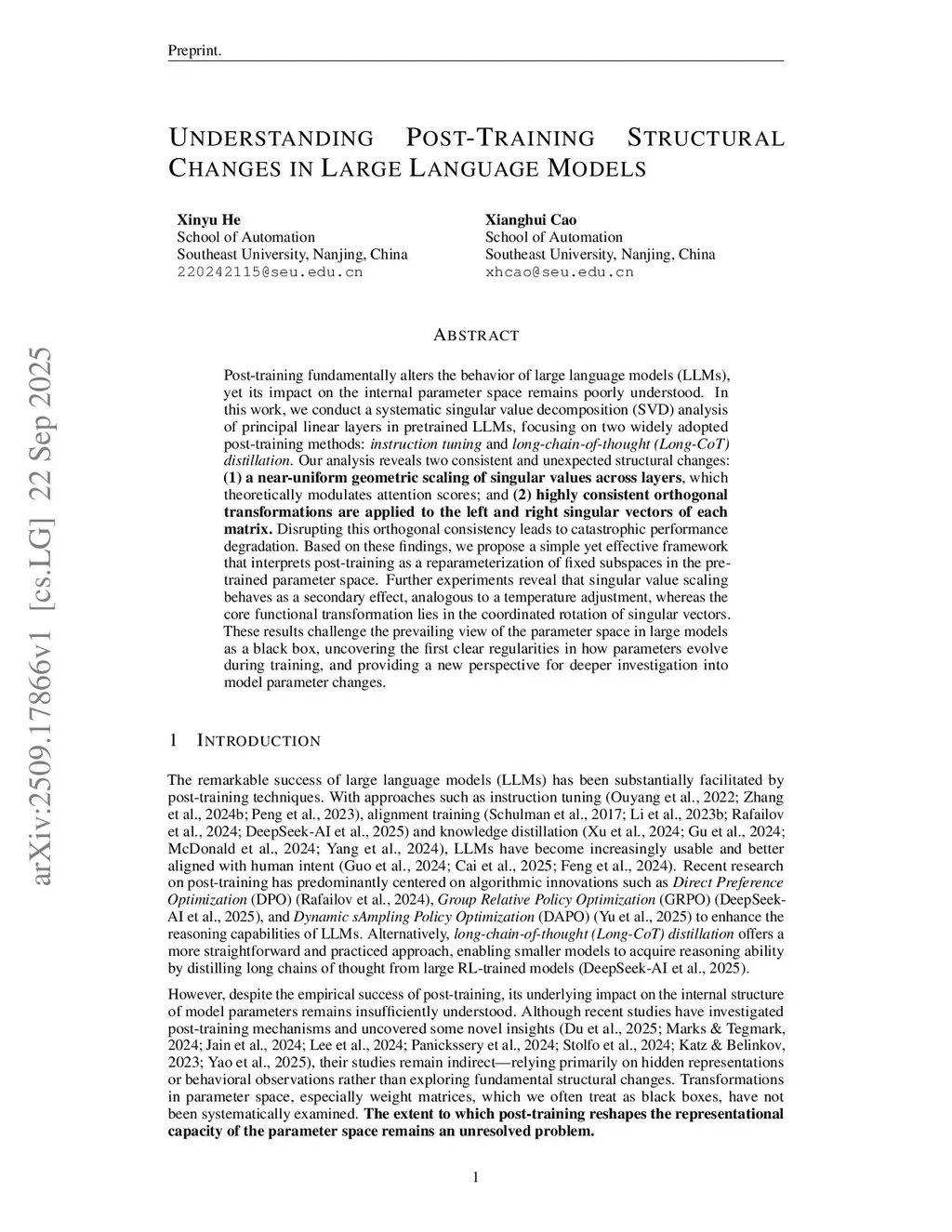 Post-training fundamentally alters the behavior of large language models (LLMs), yet its impact on the internal parameter space remains poorly understood. In this work, we conduct a systematic singular value decomposition (SVD) analysis of principal linear layers in pretrained LLMs, focusing on two widely adopted post-training methods: instruction tuning and long-chain-of-thought (Long-CoT) distillation. Our analysis reveals two consistent and unexpected structural changes:(1) a near-uniform geometric scaling of singular values across layers, which theoretically modulates attention scores; and (2) highly consistent orthogonal transformations are applied to the left and right singular vectors of each matrix. Disrupting this orthogonal consistency leads to catastrophic performance degradation. Based on these findings, we propose a simple yet effective framework that interprets post-training as a reparameterization of fixed subspaces in the pretrained parameter space. Further experiments reveal that singular value scaling behaves as a secondary effect, analogous to a temperature adjustment, whereas the core functional transformation lies in the coordinated rotation of singular vectors. These results challenge the prevailing view of the parameter space in large models as a black box, uncovering the first clear regularities in how parameters evolve during training, and providing a new perspective for deeper investigation into model parameter changes.