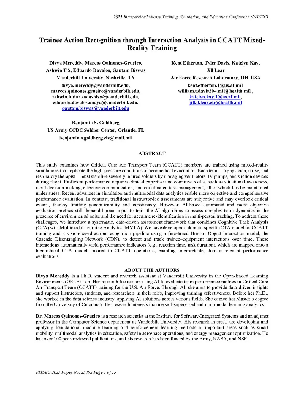 This study examines how Critical Care Air Transport Team (CCATT) members are trained using mixed-reality simulations that replicate the high-pressure conditions of aeromedical evacuation. Each team - a physician, nurse, and respiratory therapist - must stabilize severely injured soldiers by managing ventilators, IV pumps, and suction devices during flight. Proficient performance requires clinical expertise and cognitive skills, such as situational awareness, rapid decision-making, effective communication, and coordinated task management, all of which must be maintained under stress. Recent advances in simulation and multimodal data analytics enable more objective and comprehensive performance evaluation. In contrast, traditional instructor-led assessments are subjective and may overlook critical events, thereby limiting generalizability and consistency. However, AI-based automated and more objective evaluation metrics still demand human input to train the AI algorithms to assess complex team dynamics in the presence of environmental noise and the need for accurate re-identification in multi-person tracking. To address these challenges, we introduce a systematic, data-driven assessment framework that combines Cognitive Task Analysis (CTA) with Multimodal Learning Analytics (MMLA). We have developed a domain-specific CTA model for CCATT training and a vision-based action recognition pipeline using a fine-tuned Human-Object Interaction model, the Cascade Disentangling Network (CDN), to detect and track trainee-equipment interactions over time. These interactions automatically yield performance indicators (e.g., reaction time, task duration), which are mapped onto a hierarchical CTA model tailored to CCATT operations, enabling interpretable, domain-relevant performance evaluations.