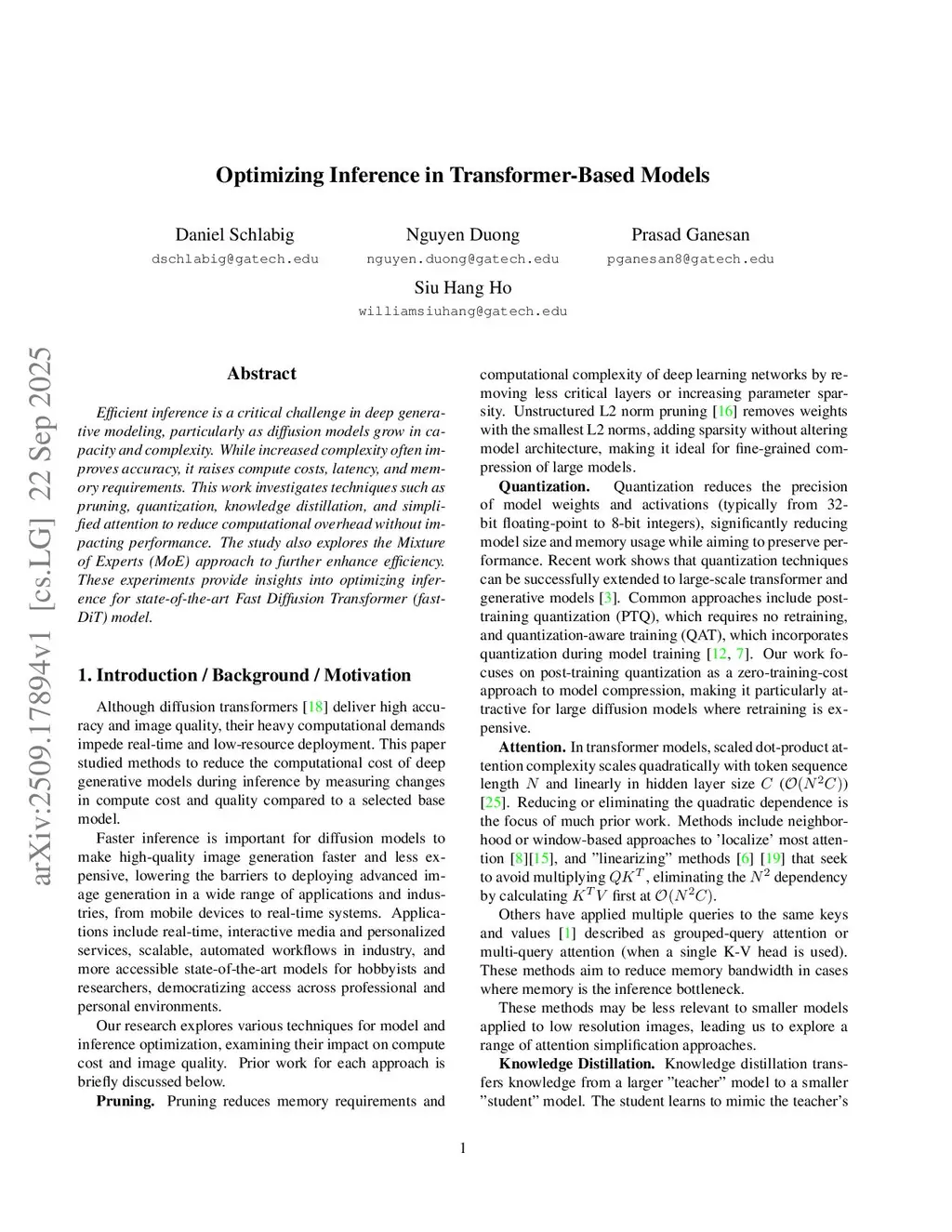 Efficient inference is a critical challenge in deep generative modeling, particularly as diffusion models grow in capacity and complexity. While increased complexity often improves accuracy, it raises compute costs, latency, and memory requirements. This work investigates techniques such as pruning, quantization, knowledge distillation, and simplified attention to reduce computational overhead without impacting performance. The study also explores the Mixture of Experts (MoE) approach to further enhance efficiency. These experiments provide insights into optimizing inference for the state-of-the-art Fast Diffusion Transformer (fast-DiT) model.
