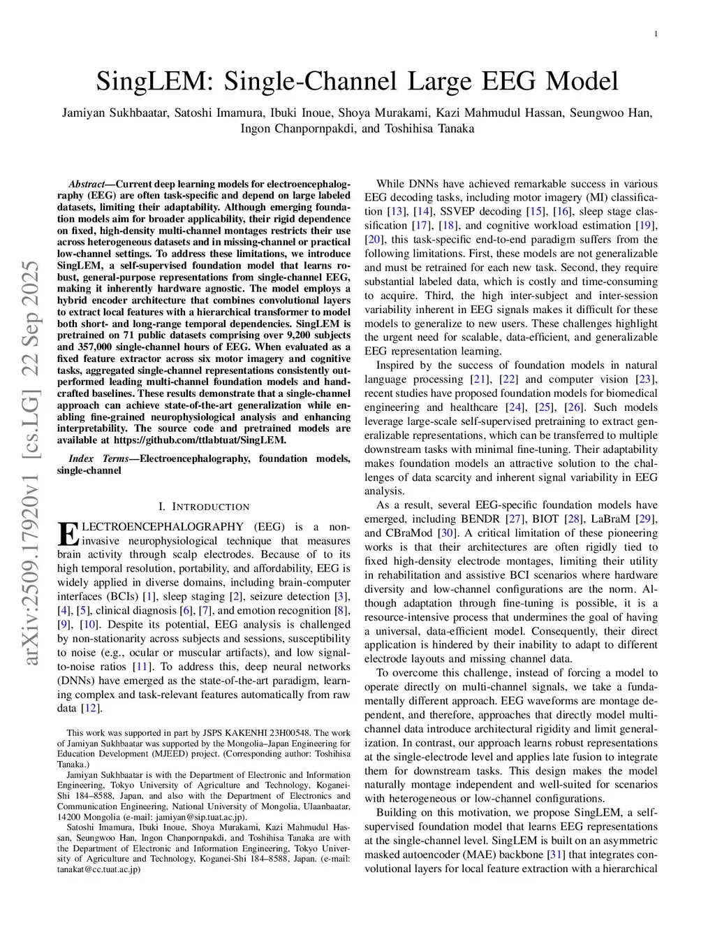 Current deep learning models for electroencephalography (EEG) are often task-specific and depend on large labeled datasets, limiting their adaptability. Although emerging foundation models aim for broader applicability, their rigid dependence on fixed, high-density multi-channel montages restricts their use across heterogeneous datasets and in missing-channel or practical low-channel settings. To address these limitations, we introduce SingLEM, a self-supervised foundation model that learns robust, general-purpose representations from single-channel EEG, making it inherently hardware agnostic. The model employs a hybrid encoder architecture that combines convolutional layers to extract local features with a hierarchical transformer to model both short- and long-range temporal dependencies. SingLEM is pretrained on 71 public datasets comprising over 9,200 subjects and 357,000 single-channel hours of EEG. When evaluated as a fixed feature extractor across six motor imagery and cognitive tasks, aggregated single-channel representations consistently outperformed leading multi-channel foundation models and handcrafted baselines. These results demonstrate that a single-channel approach can achieve state-of-the-art generalization while enabling fine-grained neurophysiological analysis and enhancing interpretability. The source code and pretrained models are available atthis https URL.