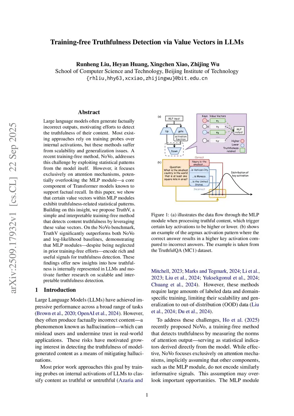 Large language models often generate factually incorrect outputs, motivating efforts to detect the truthfulness of their content. Most existing approaches rely on training probes over internal activations, but these methods suffer from scalability and generalization issues. A recent training-free method, NoVo, addresses this challenge by exploiting statistical patterns from the model itself. However, it focuses exclusively on attention mechanisms, potentially overlooking the MLP module-a core component of Transformer models known to support factual recall. In this paper, we show that certain value vectors within MLP modules exhibit truthfulness-related statistical patterns. Building on this insight, we propose TruthV, a simple and interpretable training-free method that detects content truthfulness by leveraging these value vectors. On the NoVo benchmark, TruthV significantly outperforms both NoVo and log-likelihood baselines, demonstrating that MLP modules-despite being neglected in prior training-free efforts-encode rich and useful signals for truthfulness detection. These findings offer new insights into how truthfulness is internally represented in LLMs and motivate further research on scalable and interpretable truthfulness detection.