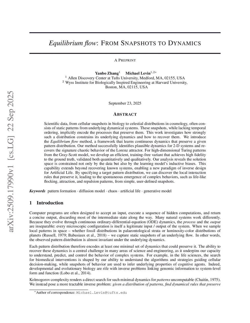 Scientific data, from cellular snapshots in biology to celestial distributions in cosmology, often consists of static patterns from underlying dynamical systems. These snapshots, while lacking temporal ordering, implicitly encode the processes that preserve them. This work investigates how strongly such a distribution constrains its underlying dynamics and how to recover them. We introduce the Equilibrium flow method, a framework that learns continuous dynamics that preserve a given pattern distribution. Our method successfully identifies plausible dynamics for 2-D systems and recovers the signature chaotic behavior of the Lorenz attractor. For high-dimensional Turing patterns from the Gray-Scott model, we develop an efficient, training-free variant that achieves high fidelity to the ground truth, validated both quantitatively and qualitatively. Our analysis reveals the solution space is constrained not only by the data but also by the learning model's inductive biases. This capability extends beyond recovering known systems, enabling a new paradigm of inverse design for Artificial Life. By specifying a target pattern distribution, we can discover the local interaction rules that preserve it, leading to the spontaneous emergence of complex behaviors, such as life-like flocking, attraction, and repulsion patterns, from simple, user-defined snapshots.