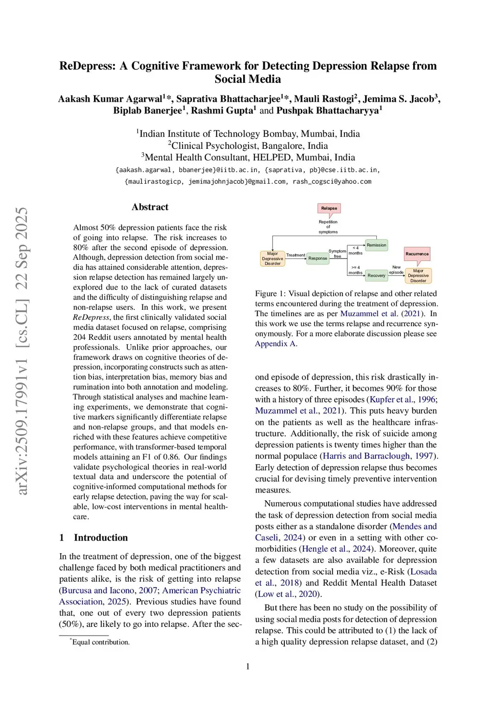 ReDepress: A Cognitive Framework for Detecting Depression Relapse from Social Media