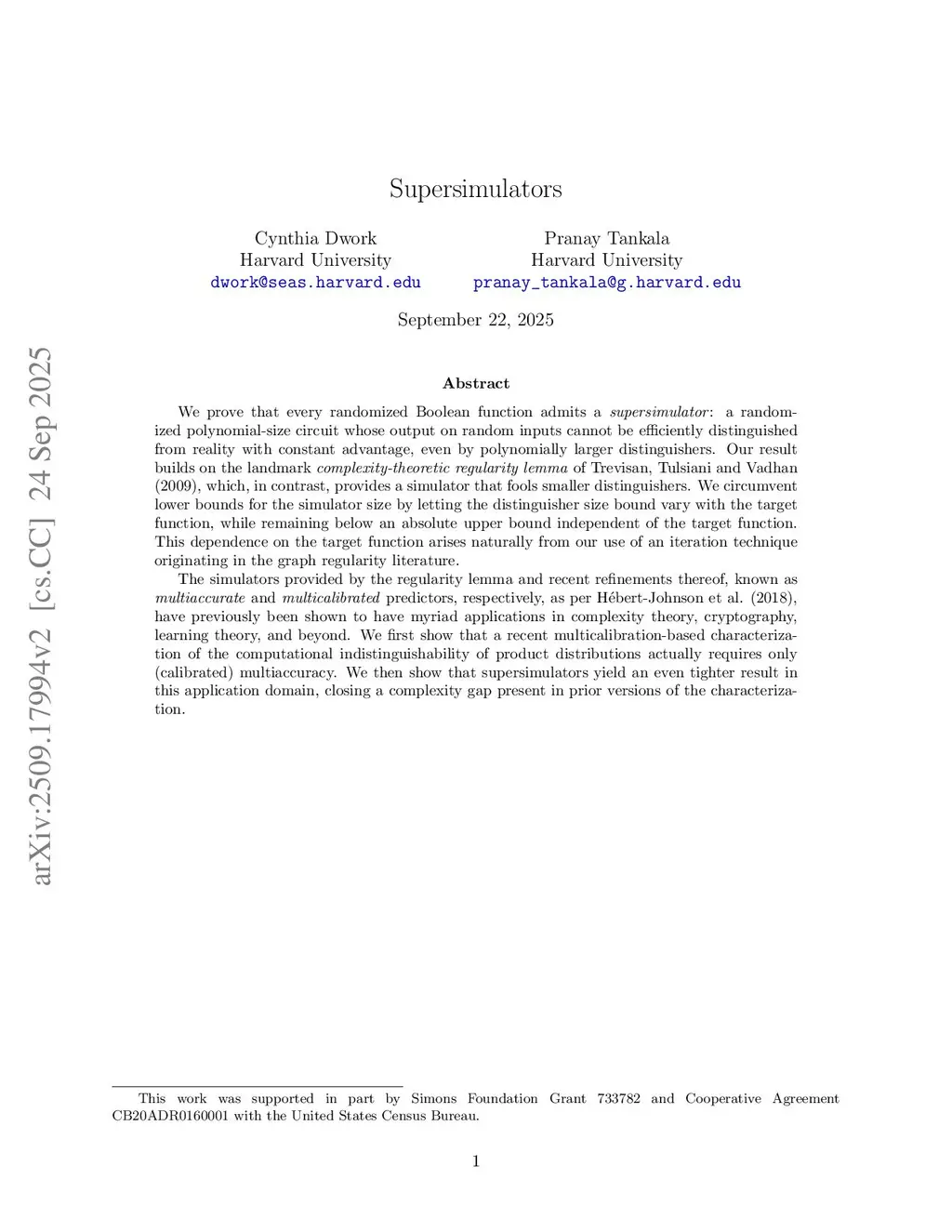 We prove that every randomized Boolean function admits a supersimulator: a randomized polynomial-size circuit whose output on random inputs cannot be efficiently distinguished from reality with constant advantage, even by polynomially larger distinguishers. Our result builds on the landmark complexity-theoretic regularity lemma of Trevisan, Tulsiani and Vadhan (2009), which, in contrast, provides a simulator that fools smaller distinguishers. We circumvent lower bounds for the simulator size by letting the distinguisher size bound vary with the target function, while remaining below an absolute upper bound independent of the target function. This dependence on the target function arises naturally from our use of an iteration technique originating in the graph regularity literature.The simulators provided by the regularity lemma and recent refinements thereof, known as multiaccurate and multicalibrated predictors, respectively, as per Hebert-Johnson et al. (2018), have previously been shown to have myriad applications in complexity theory, cryptography, learning theory, and beyond. We first show that a recent multicalibration-based characterization of the computational indistinguishability of product distributions actually requires only (calibrated) multiaccuracy. We then show that supersimulators yield an even tighter result in this application domain, closing a complexity gap present in prior versions of the characterization.