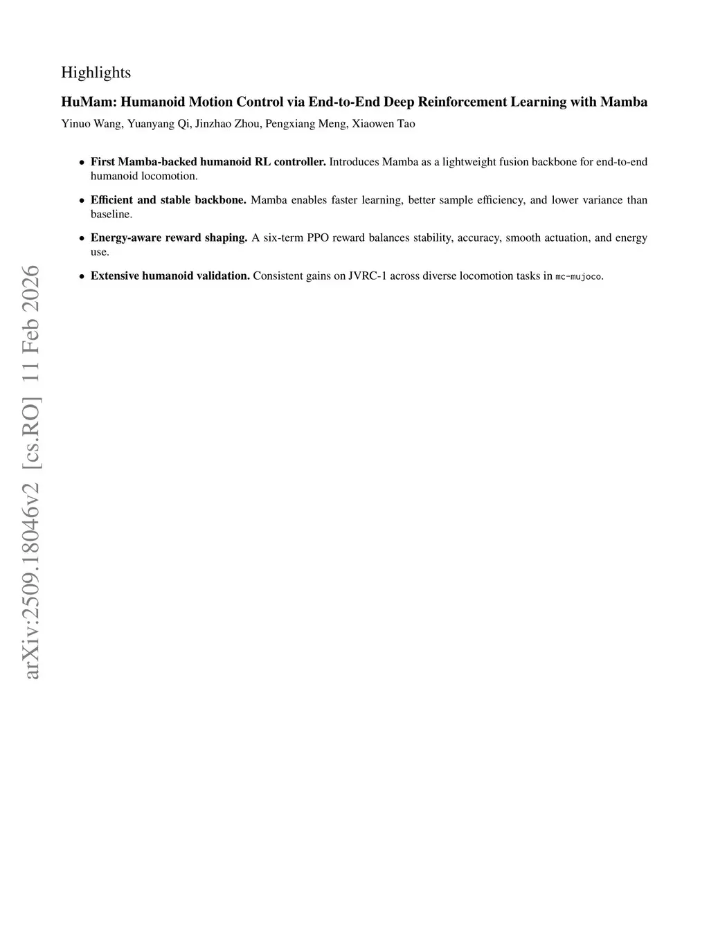 End-to-end reinforcement learning (RL) for humanoid locomotion is appealing for its compact perception-action mapping, yet practical policies often suffer from training instability, inefficient feature fusion, and high actuation cost. We present HuMam, a state-centric end-to-end RL framework that employs a single-layer Mamba encoder to fuse robot-centric states with oriented footstep targets and a continuous phase clock. The policy outputs joint position targets tracked by a low-level PD loop and is optimized with PPO. A concise six-term reward balances contact quality, swing smoothness, foot placement, posture, and body stability while implicitly promoting energy saving. On the JVRC-1 humanoid in mc-mujoco, HuMam consistently improves learning efficiency, training stability, and overall task performance over a strong feedforward baseline, while reducing power consumption and torque peaks. To our knowledge, this is the first end-to-end humanoid RL controller that adopts Mamba as the fusion backbone, demonstrating tangible gains in efficiency, stability, and control economy.