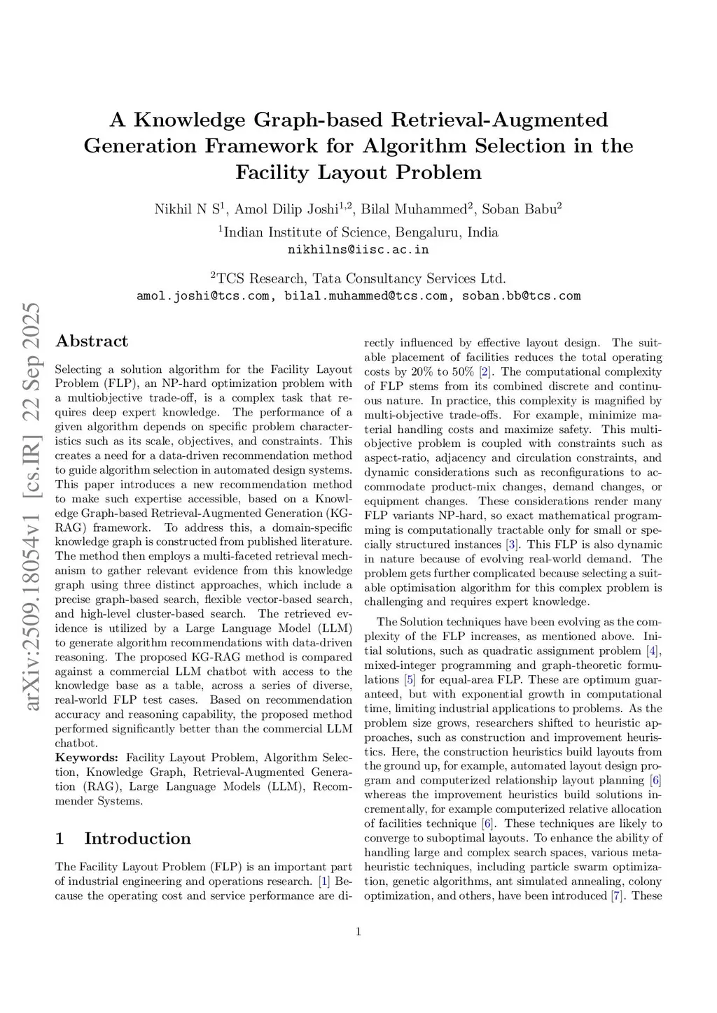 Selecting a solution algorithm for the Facility Layout Problem (FLP), an NP-hard optimization problem with multiobjective trade-off, is a complex task that requires deep expert knowledge. The performance of a given algorithm depends on the specific characteristics of the problem, such as the number of facilities, objectives, and constraints. This creates a need for a data-driven recommendation method to guide algorithm selection in automated design systems. This paper introduces a new recommendation method to make this expertise accessible, based on a Knowledge Graph-Based Retrieval-Augmented Generation (KG-RAG) framework. In this framework, a domain-specific knowledge graph (KG) is constructed from the literature. The method then employs a multifaceted retrieval mechanism to gather relevant evidence from this KG using three distinct approaches: precise graph-based search, flexible vector-based search, and cluster-based high-level search. The retrieved evidence is utilized by a Large Language Model (LLM) to generate algorithm recommendations based on data-driven reasoning. This KG-RAG framework is tested on a use case consisting of six problems comprising of complex multi-objective and multi-constraint FLP case. The results are compared with the Gemini 1.5 Flash chatbot. The results show that KG-RAG achieves an average reasoning score of 4.7 out of 5 compared to 3.3 for the baseline chatbot.