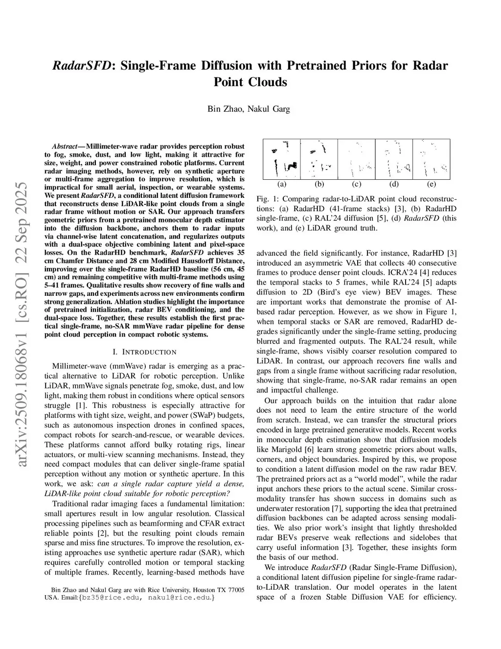 Millimeter-wave radar provides perception robust to fog, smoke, dust, and low light, making it attractive for size, weight, and power constrained robotic platforms. Current radar imaging methods, however, rely on synthetic aperture or multi-frame aggregation to improve resolution, which is impractical for small aerial, inspection, or wearable systems. We present RadarSFD, a conditional latent diffusion framework that reconstructs dense LiDAR-like point clouds from a single radar frame without motion or SAR. Our approach transfers geometric priors from a pretrained monocular depth estimator into the diffusion backbone, anchors them to radar inputs via channel-wise latent concatenation, and regularizes outputs with a dual-space objective combining latent and pixel-space losses. On the RadarHD benchmark, RadarSFD achieves 35 cm Chamfer Distance and 28 cm Modified Hausdorff Distance, improving over the single-frame RadarHD baseline (56 cm, 45 cm) and remaining competitive with multi-frame methods using 5-41 frames. Qualitative results show recovery of fine walls and narrow gaps, and experiments across new environments confirm strong generalization. Ablation studies highlight the importance of pretrained initialization, radar BEV conditioning, and the dual-space loss. Together, these results establish the first practical single-frame, no-SAR mmWave radar pipeline for dense point cloud perception in compact robotic systems.