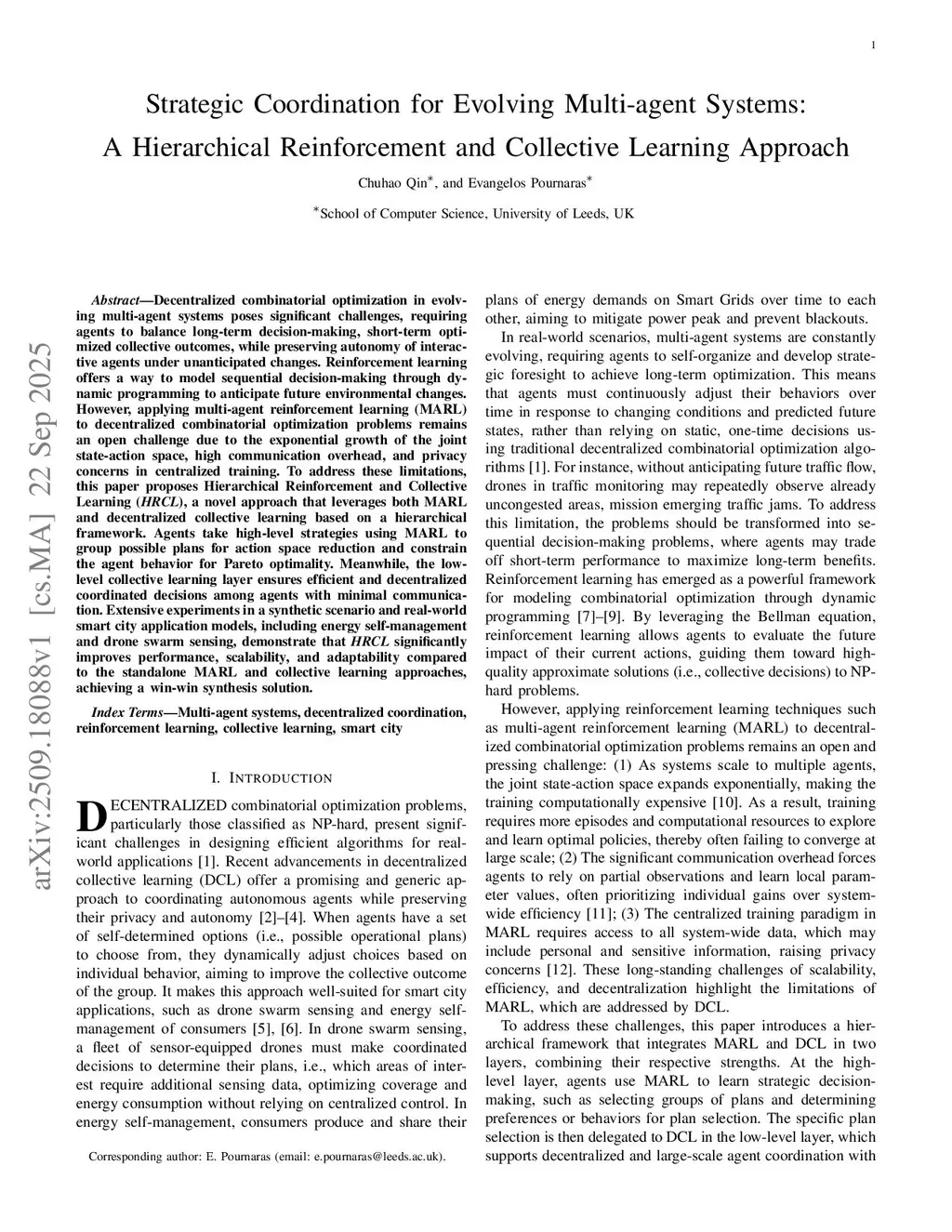 Decentralized combinatorial optimization in evolving multi-agent systems poses significant challenges, requiring agents to balance long-term decision-making, short-term optimized collective outcomes, while preserving autonomy of interactive agents under unanticipated changes. Reinforcement learning offers a way to model sequential decision-making through dynamic programming to anticipate future environmental changes. However, applying multi-agent reinforcement learning (MARL) to decentralized combinatorial optimization problems remains an open challenge due to the exponential growth of the joint state-action space, high communication overhead, and privacy concerns in centralized training. To address these limitations, this paper proposes Hierarchical Reinforcement and Collective Learning (HRCL), a novel approach that leverages both MARL and decentralized collective learning based on a hierarchical framework. Agents take high-level strategies using MARL to group possible plans for action space reduction and constrain the agent behavior for Pareto optimality. Meanwhile, the low-level collective learning layer ensures efficient and decentralized coordinated decisions among agents with minimal communication. Extensive experiments in a synthetic scenario and real-world smart city application models, including energy self-management and drone swarm sensing, demonstrate that HRCL significantly improves performance, scalability, and adaptability compared to the standalone MARL and collective learning approaches, achieving a win-win synthesis solution.