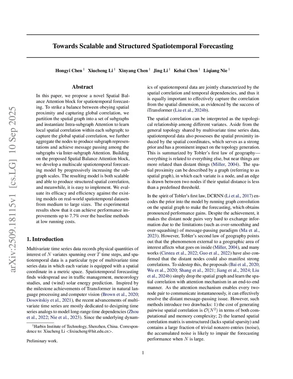 In this paper, we propose a novel Spatial Balance Attention block for spatiotemporal forecasting. To strike a balance between obeying spatial proximity and capturing global correlation, we partition the spatial graph into a set of subgraphs and instantiate Intra-subgraph Attention to learn local spatial correlation within each subgraph; to capture the global spatial correlation, we further aggregate the nodes to produce subgraph representations and achieve message passing among the subgraphs via Inter-subgraph Attention. Building on the proposed Spatial Balance Attention block, we develop a multiscale spatiotemporal forecasting model by progressively increasing the subgraph scales. The resulting model is both scalable and able to produce structured spatial correlation, and meanwhile, it is easy to implement. We evaluate its efficacy and efficiency against the existing models on real-world spatiotemporal datasets from medium to large sizes. The experimental results show that it can achieve performance improvements up to 7.7% over the baseline methods at low running costs.