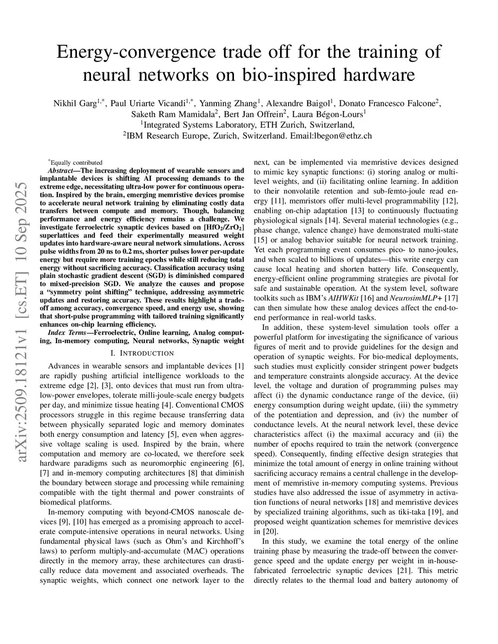 The increasing deployment of wearable sensors and implantable devices is shifting AI processing demands to the extreme edge, necessitating ultra-low power for continuous operation. Inspired by the brain, emerging memristive devices promise to accelerate neural network training by eliminating costly data transfers between compute and memory. Though, balancing performance and energy efficiency remains a challenge. We investigate ferroelectric synaptic devices based on HfO2/ZrO2 superlattices and feed their experimentally measured weight updates into hardware-aware neural network simulations. Across pulse widths from 20 ns to 0.2 ms, shorter pulses lower per-update energy but require more training epochs while still reducing total energy without sacrificing accuracy. Classification accuracy using plain stochastic gradient descent (SGD) is diminished compared to mixed-precision SGD. We analyze the causes and propose a ``symmetry point shifting'' technique, addressing asymmetric updates and restoring accuracy. These results highlight a trade-off among accuracy, convergence speed, and energy use, showing that short-pulse programming with tailored training significantly enhances on-chip learning efficiency.