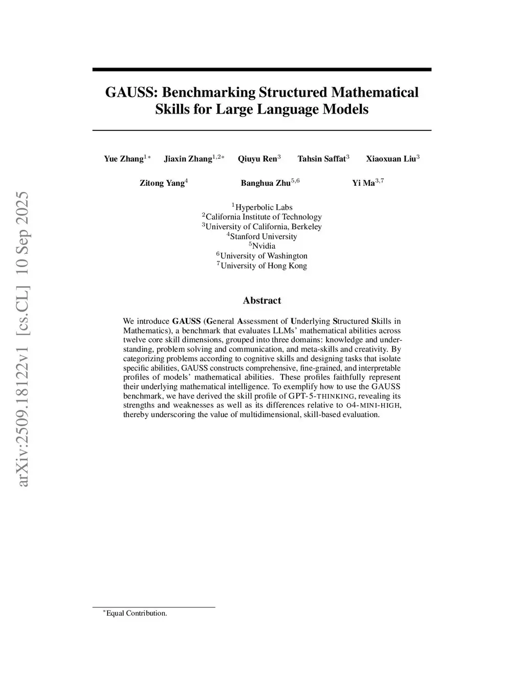 We introduce \textbf{GAUSS} (\textbf{G}eneral \textbf{A}ssessment of \textbf{U}nderlying \textbf{S}tructured \textbf{S}kills in Mathematics), a benchmark that evaluates LLMs' mathematical abilities across twelve core skill dimensions, grouped into three domains: knowledge and understanding, problem solving and communication, and meta-skills and creativity. By categorizing problems according to cognitive skills and designing tasks that isolate specific abilities, GAUSS constructs comprehensive, fine-grained, and interpretable profiles of models' mathematical abilities. These profiles faithfully represent their underlying mathematical intelligence. To exemplify how to use the \textsc{GAUSS} benchmark, we have derived the skill profile of \textsc{GPT-5-thinking}, revealing its strengths and weaknesses as well as its differences relative to \textsc{o4-mini-high}, thereby underscoring the value of multidimensional, skill-based evaluation.