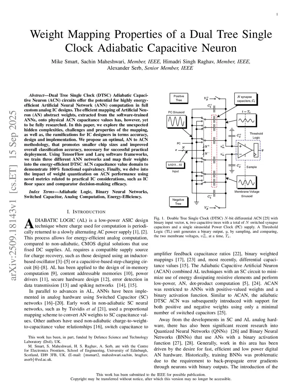 Dual Tree Single Clock (DTSC) Adiabatic Capacitive Neuron (ACN) circuits offer the potential for highly energy-efficient Artificial Neural Network (ANN) computation in full custom analog IC designs. The efficient mapping of Artificial Neuron (AN) abstract weights, extracted from the software-trained ANNs, onto physical ACN capacitance values has, however, yet to be fully researched. In this paper, we explore the unexpected hidden complexities, challenges and properties of the mapping, as well as, the ramifications for IC designers in terms accuracy, design and implementation. We propose an optimal, AN to ACN methodology, that promotes smaller chip sizes and improved overall classification accuracy, necessary for successful practical deployment. Using TensorFlow and Larq software frameworks, we train three different ANN networks and map their weights into the energy-efficient DTSC ACN capacitance value domain to demonstrate 100% functional equivalency. Finally, we delve into the impact of weight quantization on ACN performance using novel metrics related to practical IC considerations, such as IC floor space and comparator decision-making efficacy.