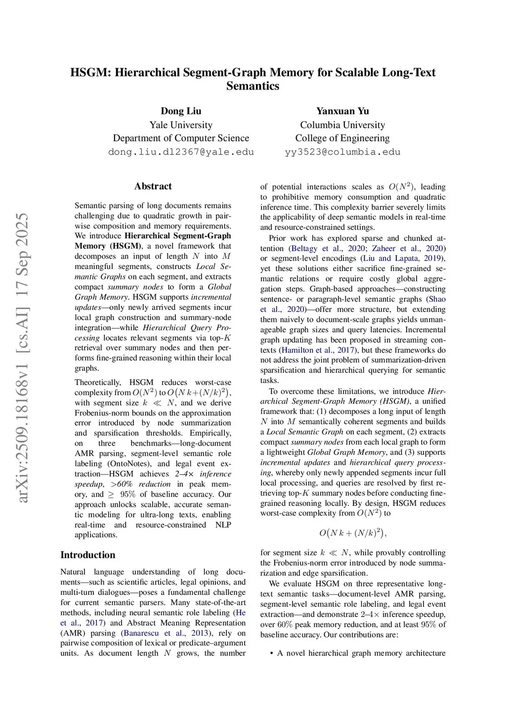 Semantic parsing of long documents remains challenging due to quadratic growth in pairwise composition and memory requirements. We introduce \textbf{Hierarchical Segment-Graph Memory (HSGM)}, a novel framework that decomposes an input of length into meaningful segments, constructs \emph{Local Semantic Graphs} on each segment, and extracts compact \emph{summary nodes} to form a \emph{Global Graph Memory}. HSGM supports \emph{incremental updates} -- only newly arrived segments incur local graph construction and summary-node integration -- while \emph{Hierarchical Query Processing} locates relevant segments via top- retrieval over summary nodes and then performs fine-grained reasoning within their local graphs.Theoretically, HSGM reduces worst-case complexity from to , with segment size , and we derive Frobenius-norm bounds on the approximation error introduced by node summarization and sparsification thresholds. Empirically, on three benchmarks -- long-document AMR parsing, segment-level semantic role labeling (OntoNotes), and legal event extraction -- HSGM achieves \emph{2--4 inference speedup}, \emph{ reduction} in peak memory, and \emph{} of baseline accuracy. Our approach unlocks scalable, accurate semantic modeling for ultra-long texts, enabling real-time and resource-constrained NLP applications.