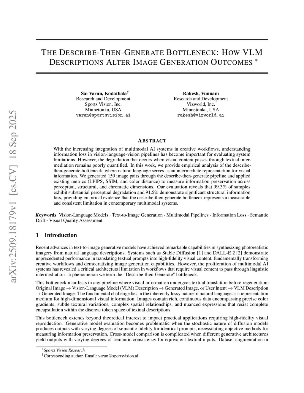 With the increasing integration of multimodal AI systems in creative workflows, understanding information loss in vision-language-vision pipelines has become important for evaluating system limitations. However, the degradation that occurs when visual content passes through textual intermediation remains poorly quantified. In this work, we provide empirical analysis of the describe-then-generate bottleneck, where natural language serves as an intermediate representation for visual information. We generated 150 image pairs through the describe-then-generate pipeline and applied existing metrics (LPIPS, SSIM, and color distance) to measure information preservation across perceptual, structural, and chromatic dimensions. Our evaluation reveals that 99.3% of samples exhibit substantial perceptual degradation and 91.5% demonstrate significant structural information loss, providing empirical evidence that the describe-then-generate bottleneck represents a measurable and consistent limitation in contemporary multimodal systems.