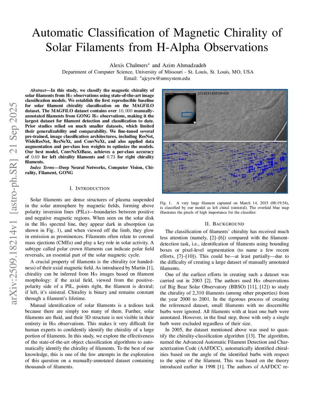 In this study, we classify the magnetic chirality of solar filaments from H-Alpha observations using state-of-the-art image classification models. We establish the first reproducible baseline for solar filament chirality classification on the MAGFiLO dataset. The MAGFiLO dataset contains over 10,000 manually-annotated filaments from GONG H-Alpha observations, making it the largest dataset for filament detection and classification to date. Prior studies relied on much smaller datasets, which limited their generalizability and comparability. We fine-tuned several pre-trained, image classification architectures, including ResNet, WideResNet, ResNeXt, and ConvNeXt, and also applied data augmentation and per-class loss weights to optimize the models. Our best model, ConvNeXtBase, achieves a per-class accuracy of 0.69 for left chirality filaments and for right chirality filaments.