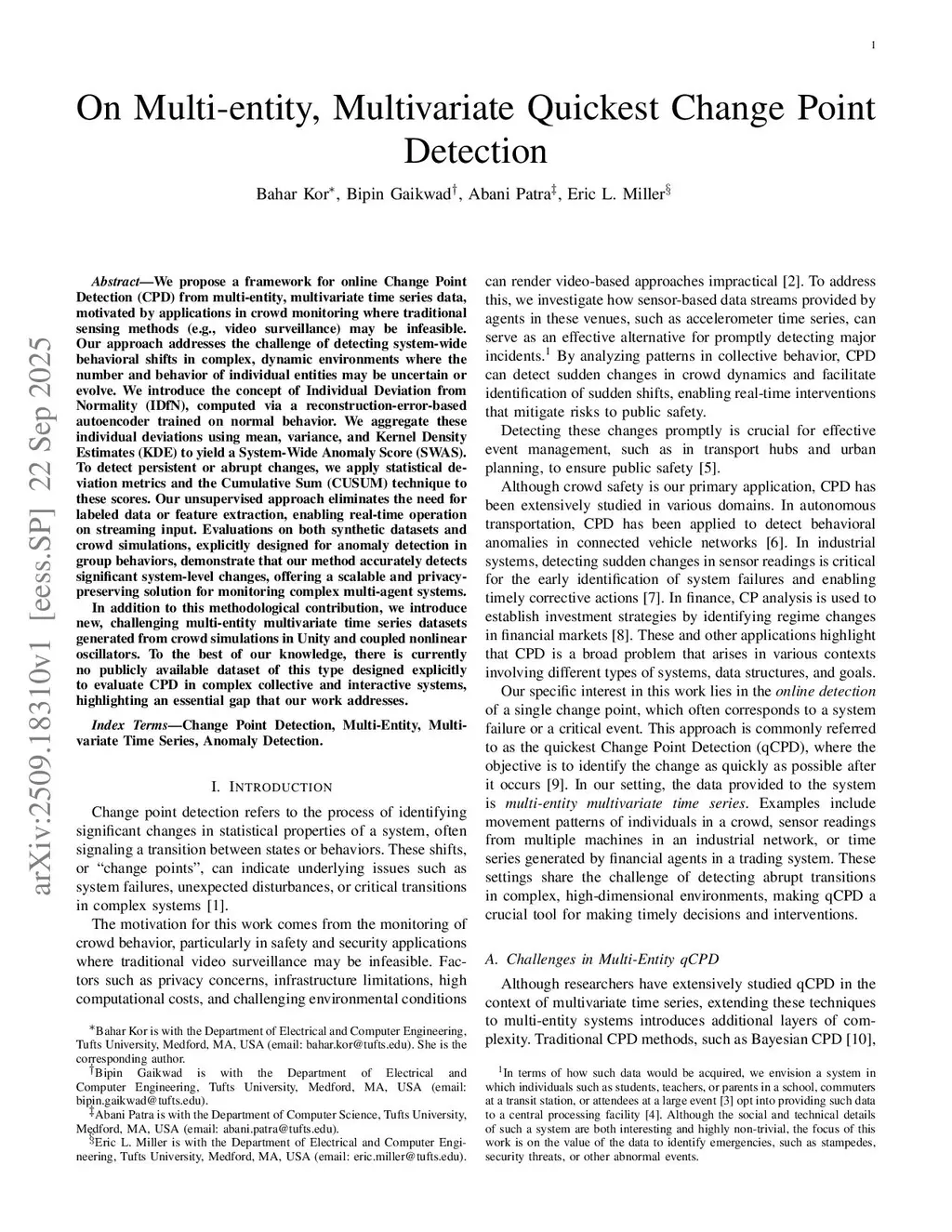 We propose a framework for online Change Point Detection (CPD) from multi-entity, multivariate time series data, motivated by applications in crowd monitoring where traditional sensing methods (e.g., video surveillance) may be infeasible. Our approach addresses the challenge of detecting system-wide behavioral shifts in complex, dynamic environments where the number and behavior of individual entities may be uncertain or evolve. We introduce the concept of Individual Deviation from Normality (IDfN), computed via a reconstruction-error-based autoencoder trained on normal behavior. We aggregate these individual deviations using mean, variance, and Kernel Density Estimates (KDE) to yield a System-Wide Anomaly Score (SWAS). To detect persistent or abrupt changes, we apply statistical deviation metrics and the Cumulative Sum (CUSUM) technique to these scores. Our unsupervised approach eliminates the need for labeled data or feature extraction, enabling real-time operation on streaming input. Evaluations on both synthetic datasets and crowd simulations, explicitly designed for anomaly detection in group behaviors, demonstrate that our method accurately detects significant system-level changes, offering a scalable and privacy-preserving solution for monitoring complex multi-agent systems. In addition to this methodological contribution, we introduce new, challenging multi-entity multivariate time series datasets generated from crowd simulations in Unity and coupled nonlinear oscillators. To the best of our knowledge, there is currently no publicly available dataset of this type designed explicitly to evaluate CPD in complex collective and interactive systems, highlighting an essential gap that our work addresses.