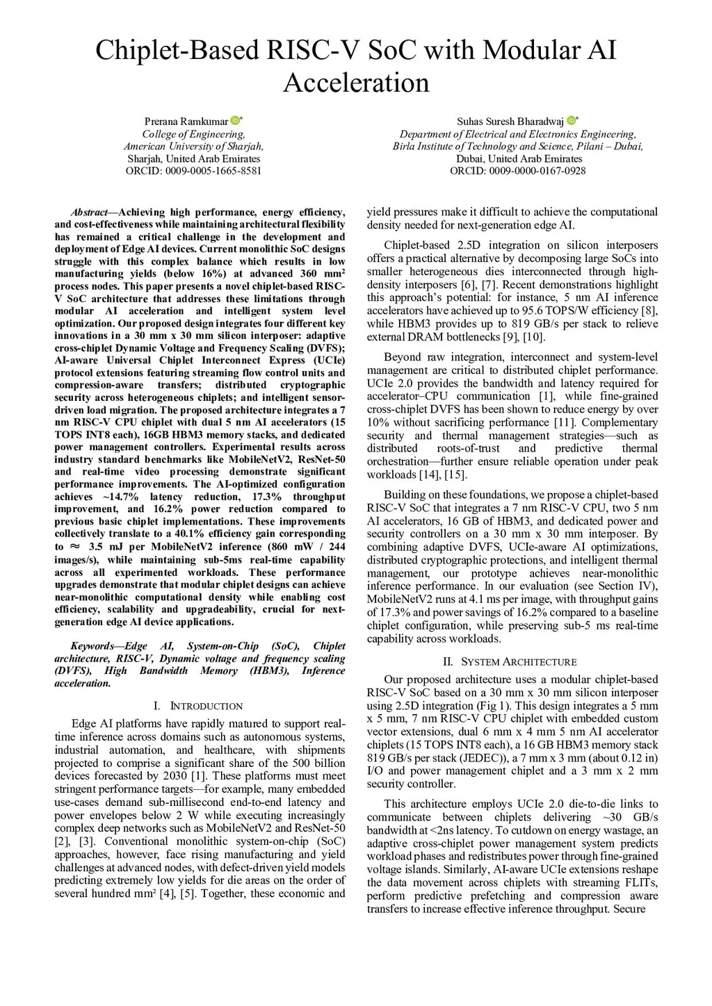 Achieving high performance, energy efficiency, and cost-effectiveness while maintaining architectural flexibility is a critical challenge in the development and deployment of edge AI devices. Monolithic SoC designs struggle with this complex balance mainly due to low manufacturing yields (below 16%) at advanced 360 mm^2 process nodes. This paper presents a novel chiplet-based RISC-V SoC architecture that addresses these limitations through modular AI acceleration and intelligent system level optimization. Our proposed design integrates 4 different key innovations in a 30mm x 30mm silicon interposer: adaptive cross-chiplet Dynamic Voltage and Frequency Scaling (DVFS); AI-aware Universal Chiplet Interconnect Express (UCIe) protocol extensions featuring streaming flow control units and compression-aware transfers; distributed cryptographic security across heterogeneous chiplets; and intelligent sensor-driven load migration. The proposed architecture integrates a 7nm RISC-V CPU chiplet with dual 5nm AI accelerators (15 TOPS INT8 each), 16GB HBM3 memory stacks, and dedicated power management controllers. Experimental results across industry standard benchmarks like MobileNetV2, ResNet-50 and real-time video processing demonstrate significant performance improvements. The AI-optimized configuration achieves ~14.7% latency reduction, 17.3% throughput improvement, and 16.2% power reduction compared to previous basic chiplet implementations. These improvements collectively translate to a 40.1% efficiency gain corresponding to ~3.5 mJ per MobileNetV2 inference (860 mW/244 images/s), while maintaining sub-5ms real-time capability across all experimented workloads. These performance upgrades demonstrate that modular chiplet designs can achieve near-monolithic computational density while enabling cost efficiency, scalability and upgradeability, crucial for next-generation edge AI device applications.
