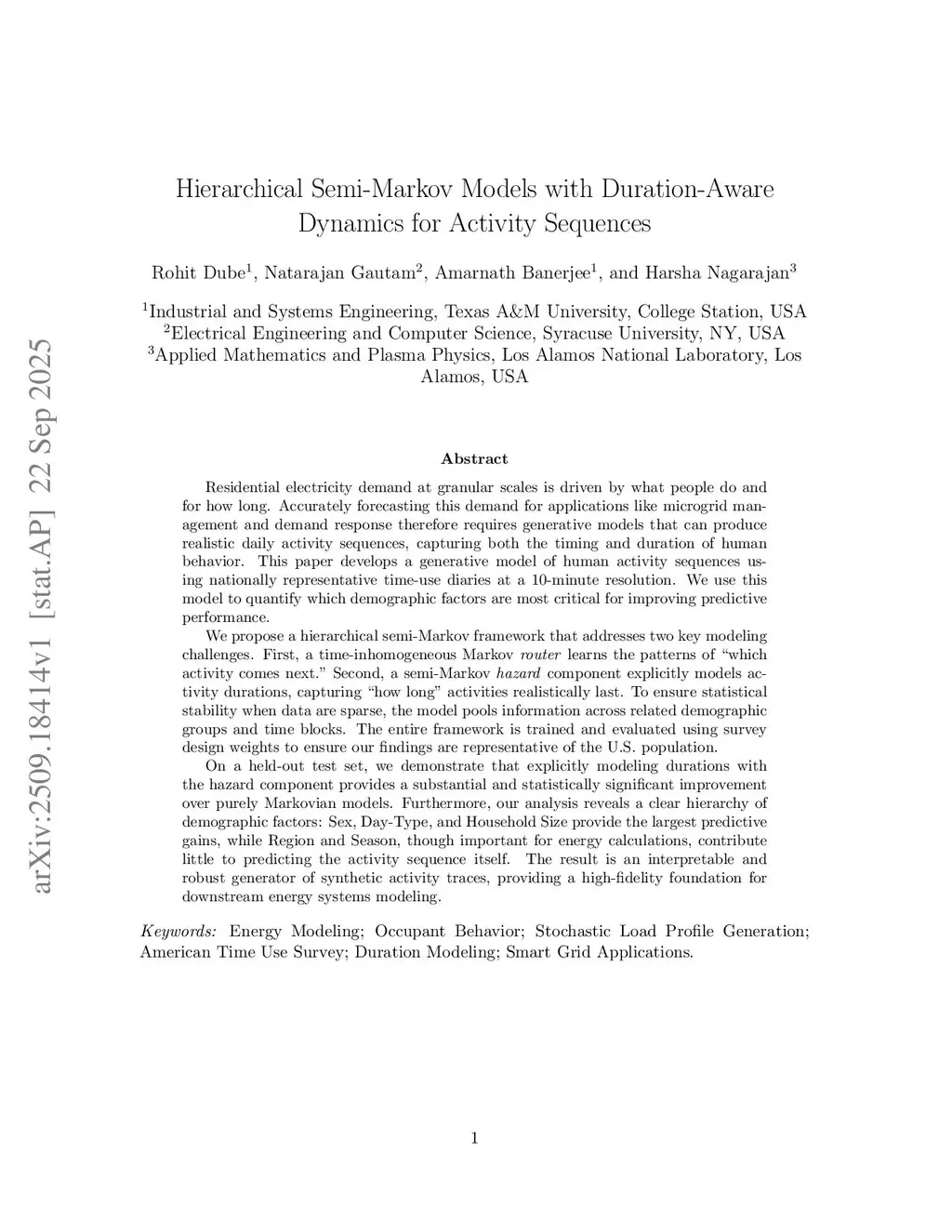 Residential electricity demand at granular scales is driven by what people do and for how long. Accurately forecasting this demand for applications like microgrid management and demand response therefore requires generative models that can produce realistic daily activity sequences, capturing both the timing and duration of human behavior. This paper develops a generative model of human activity sequences using nationally representative time-use diaries at a 10-minute resolution. We use this model to quantify which demographic factors are most critical for improving predictive performance.We propose a hierarchical semi-Markov framework that addresses two key modeling challenges. First, a time-inhomogeneous Markov \emph{router} learns the patterns of ``which activity comes next." Second, a semi-Markov \emph{hazard} component explicitly models activity durations, capturing ``how long" activities realistically last. To ensure statistical stability when data are sparse, the model pools information across related demographic groups and time blocks. The entire framework is trained and evaluated using survey design weights to ensure our findings are representative of the U.S. population.On a held-out test set, we demonstrate that explicitly modeling durations with the hazard component provides a substantial and statistically significant improvement over purely Markovian models. Furthermore, our analysis reveals a clear hierarchy of demographic factors: Sex, Day-Type, and Household Size provide the largest predictive gains, while Region and Season, though important for energy calculations, contribute little to predicting the activity sequence itself. The result is an interpretable and robust generator of synthetic activity traces, providing a high-fidelity foundation for downstream energy systems modeling.