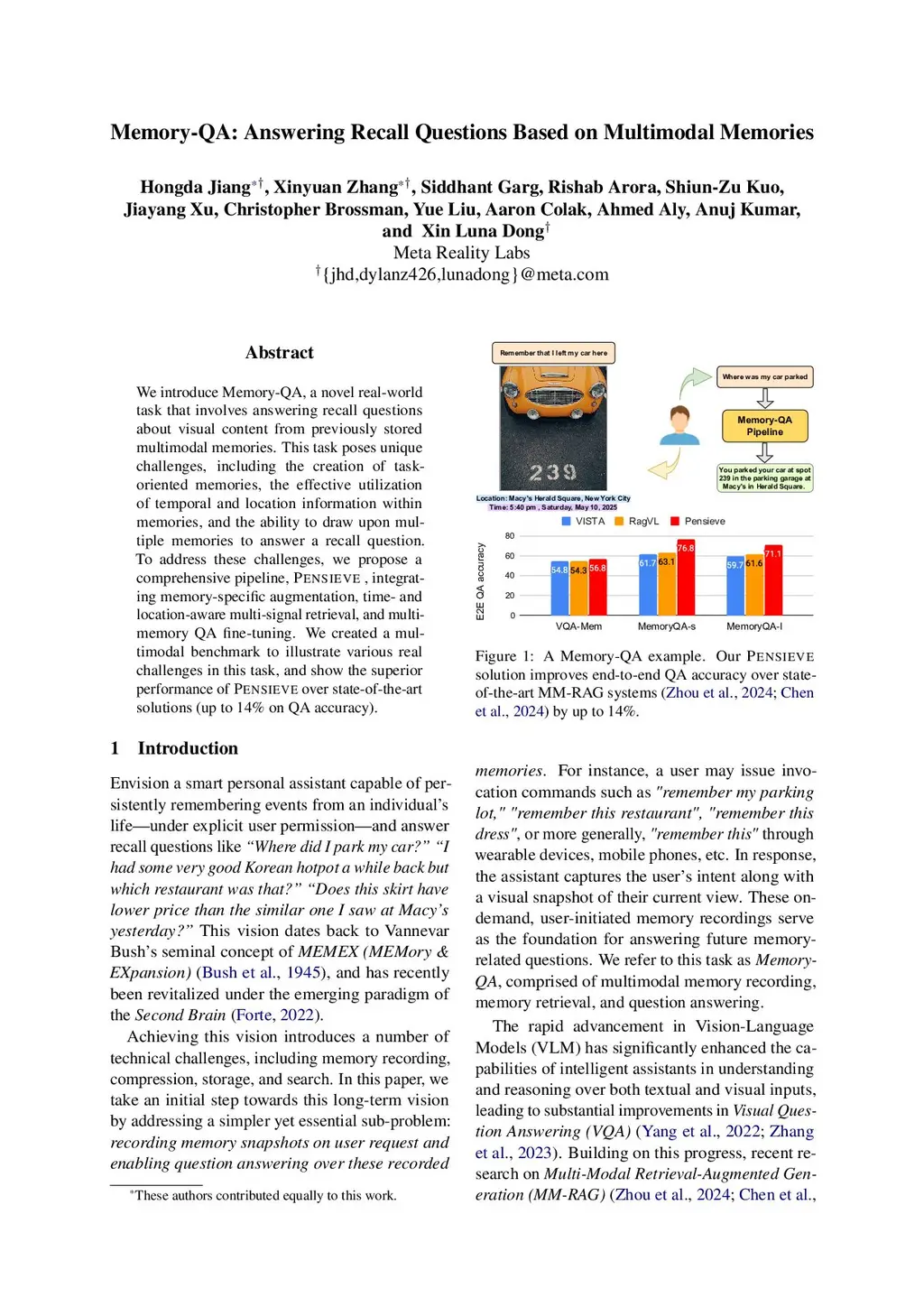 We introduce Memory-QA, a novel real-world task that involves answering recall questions about visual content from previously stored multimodal memories. This task poses unique challenges, including the creation of task-oriented memories, the effective utilization of temporal and location information within memories, and the ability to draw upon multiple memories to answer a recall question. To address these challenges, we propose a comprehensive pipeline, Pensieve, integrating memory-specific augmentation, time- and location-aware multi-signal retrieval, and multi-memory QA fine-tuning. We created a multimodal benchmark to illustrate various real challenges in this task, and show the superior performance of Pensieve over state-of-the-art solutions (up to 14% on QA accuracy).