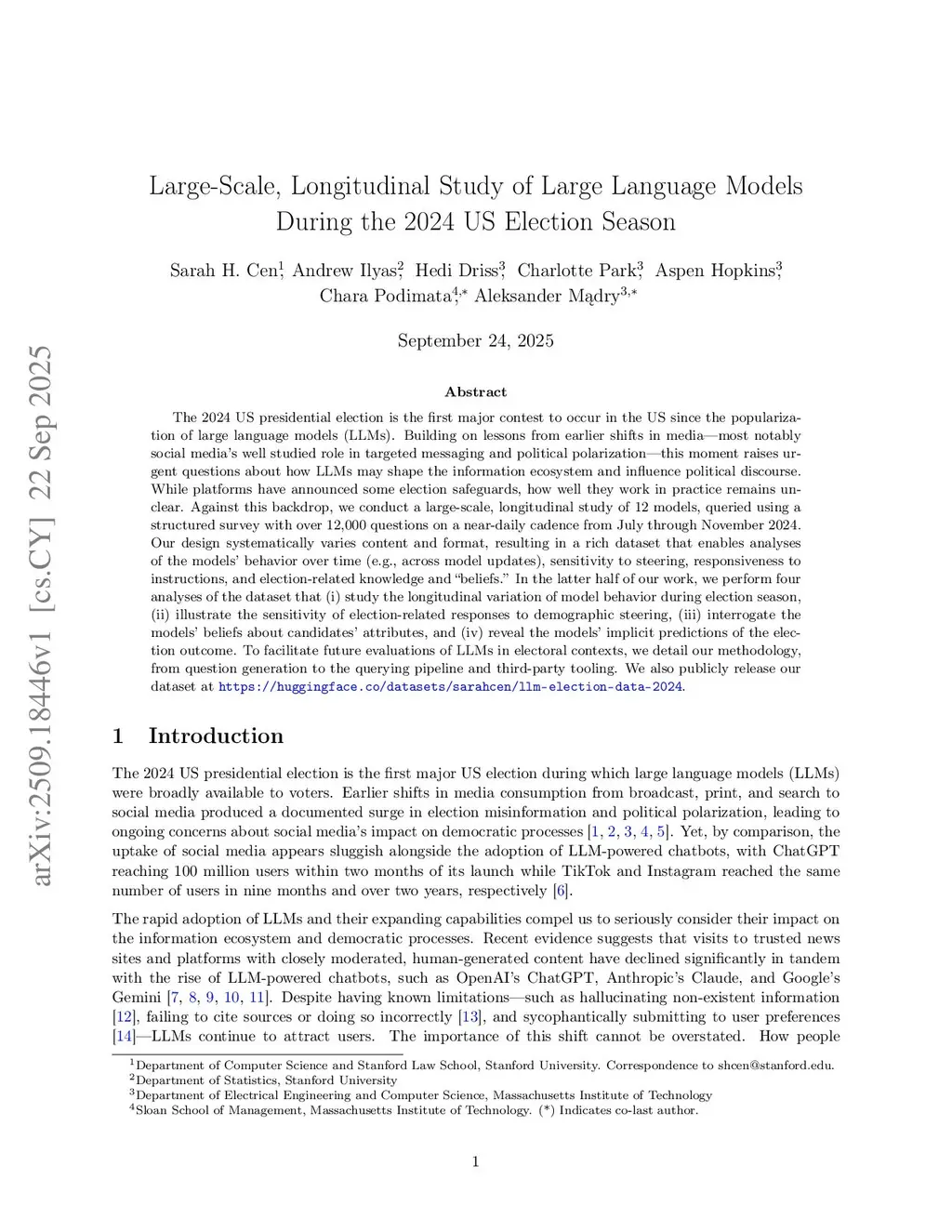 Large-Scale, Longitudinal Study of Large Language Models During the 2024 US Election Season