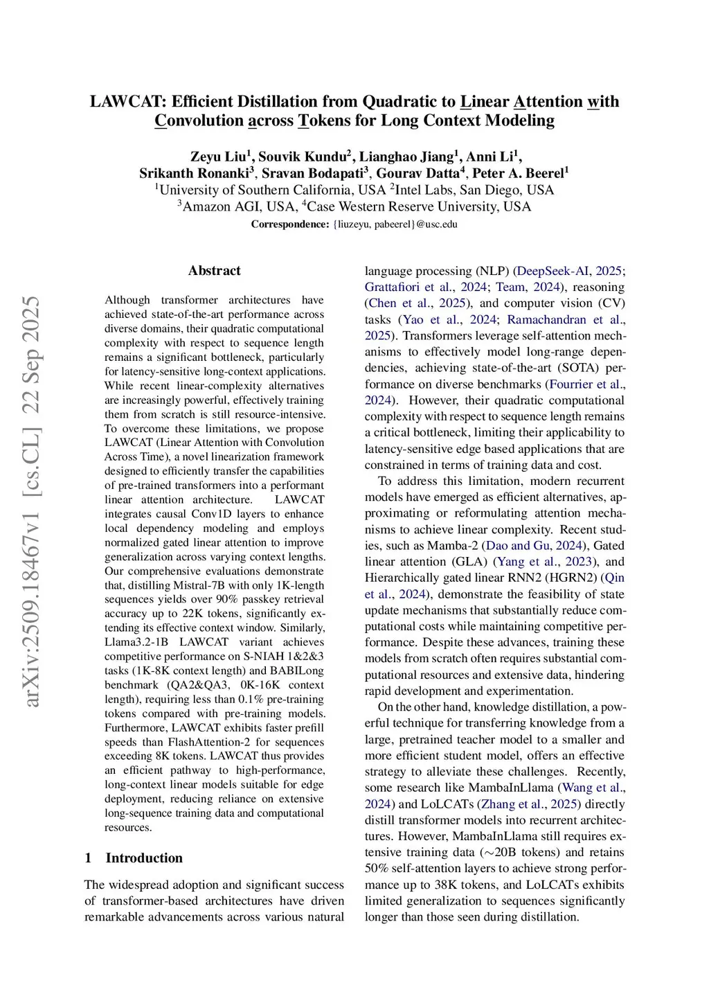 Although transformer architectures have achieved state-of-the-art performance across diverse domains, their quadratic computational complexity with respect to sequence length remains a significant bottleneck, particularly for latency-sensitive long-context applications. While recent linear-complexity alternatives are increasingly powerful, effectively training them from scratch is still resource-intensive. To overcome these limitations, we propose LAWCAT (Linear Attention with Convolution Across Time), a novel linearization framework designed to efficiently transfer the capabilities of pre-trained transformers into a performant linear attention architecture. LAWCAT integrates causal Conv1D layers to enhance local dependency modeling and employs normalized gated linear attention to improve generalization across varying context lengths. Our comprehensive evaluations demonstrate that, distilling Mistral-7B with only 1K-length sequences yields over 90\% passkey retrieval accuracy up to 22K tokens, significantly extending its effective context window. Similarly, Llama3.2-1B LAWCAT variant achieves competitive performance on S-NIAH 1\&2\&3 tasks (1K-8K context length) and BABILong benchmark (QA2\&QA3, 0K-16K context length), requiring less than 0.1\% pre-training tokens compared with pre-training models. Furthermore, LAWCAT exhibits faster prefill speeds than FlashAttention-2 for sequences exceeding 8K tokens. LAWCAT thus provides an efficient pathway to high-performance, long-context linear models suitable for edge deployment, reducing reliance on extensive long-sequence training data and computational resources. Code is released at:this https URL