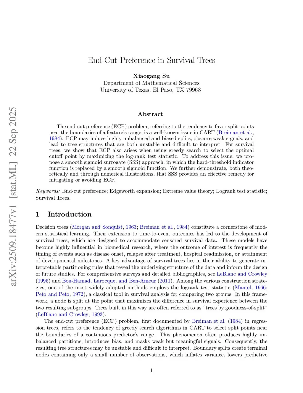 The end-cut preference (ECP) problem, referring to the tendency to favor split points near the boundaries of a feature's range, is a well-known issue in CART (Breiman et al., 1984). ECP may induce highly imbalanced and biased splits, obscure weak signals, and lead to tree structures that are both unstable and difficult to interpret. For survival trees, we show that ECP also arises when using greedy search to select the optimal cutoff point by maximizing the log-rank test statistic. To address this issue, we propose a smooth sigmoid surrogate (SSS) approach, in which the hard-threshold indicator function is replaced by a smooth sigmoid function. We further demonstrate, both theoretically and through numerical illustrations, that SSS provides an effective remedy for mitigating or avoiding ECP.