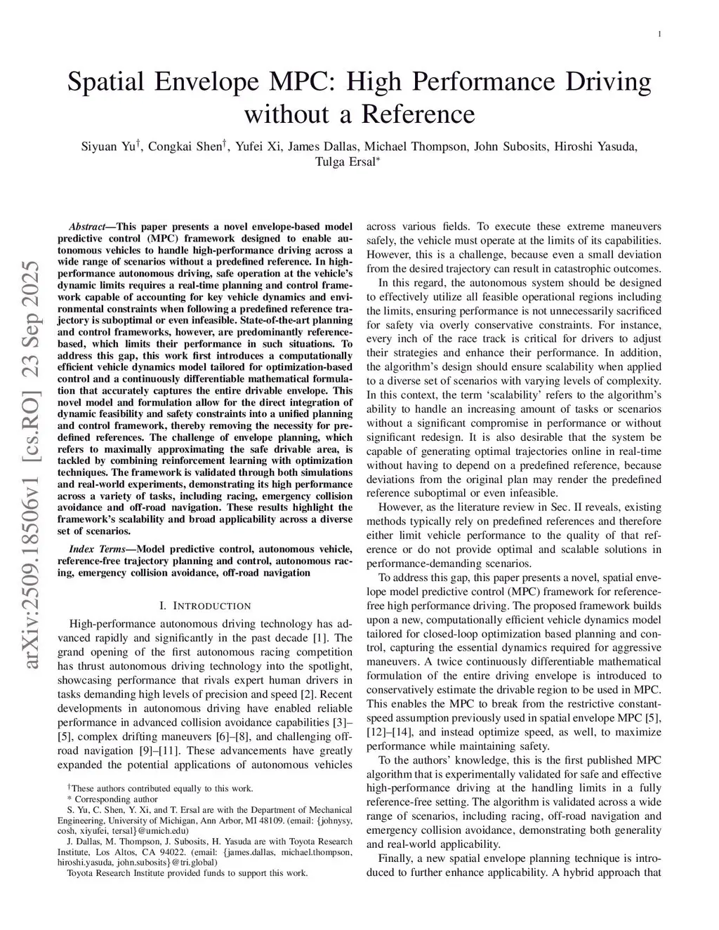 This paper presents a novel envelope based model predictive control (MPC) framework designed to enable autonomous vehicles to handle high performance driving across a wide range of scenarios without a predefined reference. In high performance autonomous driving, safe operation at the vehicle's dynamic limits requires a real time planning and control framework capable of accounting for key vehicle dynamics and environmental constraints when following a predefined reference trajectory is suboptimal or even infeasible. State of the art planning and control frameworks, however, are predominantly reference based, which limits their performance in such situations. To address this gap, this work first introduces a computationally efficient vehicle dynamics model tailored for optimization based control and a continuously differentiable mathematical formulation that accurately captures the entire drivable envelope. This novel model and formulation allow for the direct integration of dynamic feasibility and safety constraints into a unified planning and control framework, thereby removing the necessity for predefined references. The challenge of envelope planning, which refers to maximally approximating the safe drivable area, is tackled by combining reinforcement learning with optimization techniques. The framework is validated through both simulations and real world experiments, demonstrating its high performance across a variety of tasks, including racing, emergency collision avoidance and off road navigation. These results highlight the framework's scalability and broad applicability across a diverse set of scenarios.