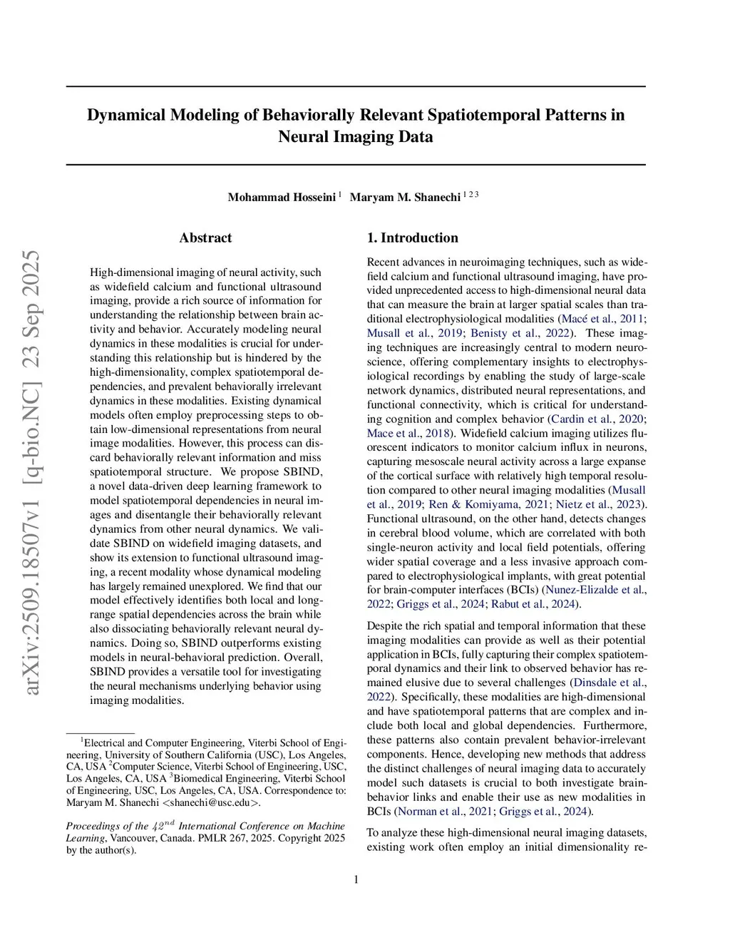 High-dimensional imaging of neural activity, such as widefield calcium and functional ultrasound imaging, provide a rich source of information for understanding the relationship between brain activity and behavior. Accurately modeling neural dynamics in these modalities is crucial for understanding this relationship but is hindered by the high-dimensionality, complex spatiotemporal dependencies, and prevalent behaviorally irrelevant dynamics in these modalities. Existing dynamical models often employ preprocessing steps to obtain low-dimensional representations from neural image modalities. However, this process can discard behaviorally relevant information and miss spatiotemporal structure. We propose SBIND, a novel data-driven deep learning framework to model spatiotemporal dependencies in neural images and disentangle their behaviorally relevant dynamics from other neural dynamics. We validate SBIND on widefield imaging datasets, and show its extension to functional ultrasound imaging, a recent modality whose dynamical modeling has largely remained unexplored. We find that our model effectively identifies both local and long-range spatial dependencies across the brain while also dissociating behaviorally relevant neural dynamics. Doing so, SBIND outperforms existing models in neural-behavioral prediction. Overall, SBIND provides a versatile tool for investigating the neural mechanisms underlying behavior using imaging modalities.