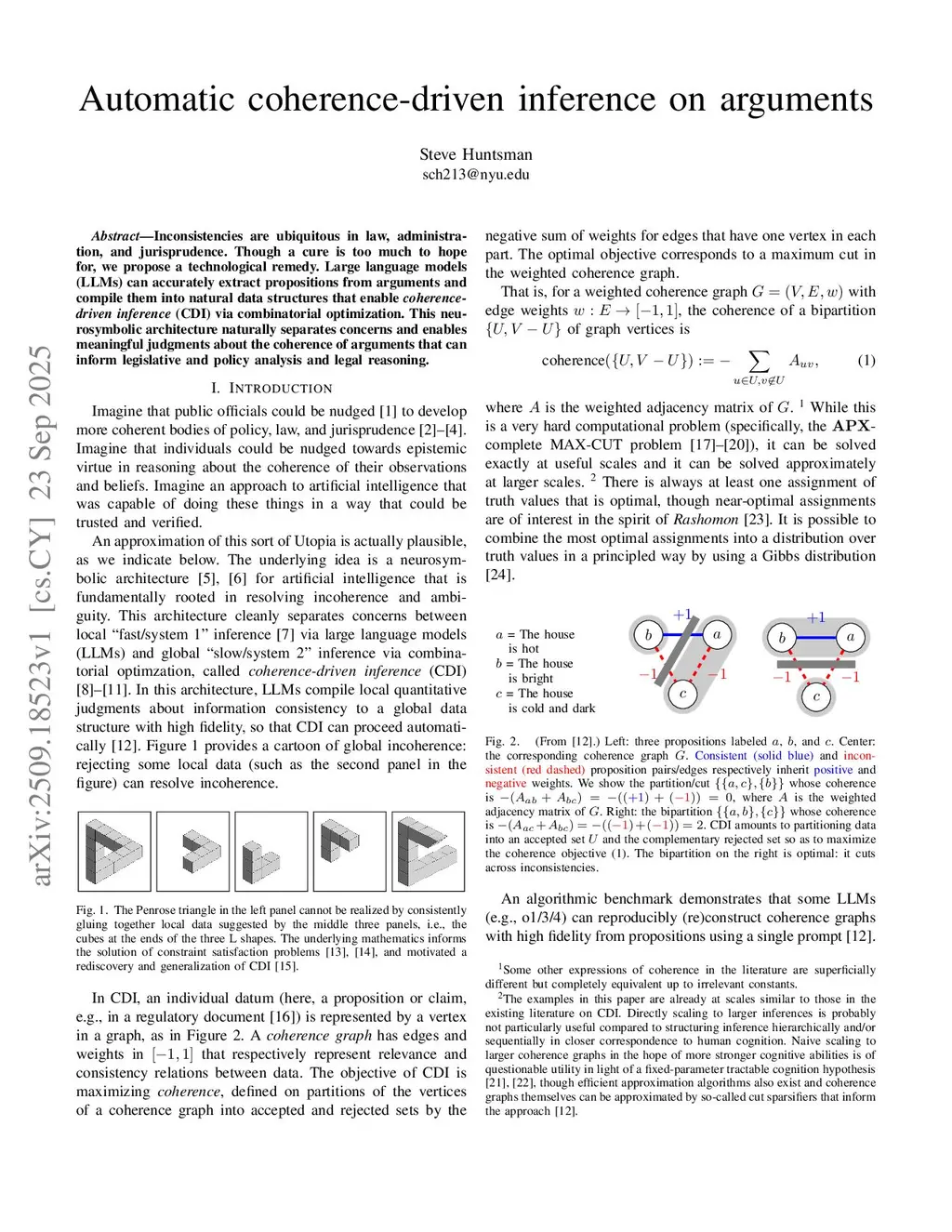 Inconsistencies are ubiquitous in law, administration, and jurisprudence. Though a cure is too much to hope for, we propose a technological remedy. Large language models (LLMs) can accurately extract propositions from arguments and compile them into natural data structures that enable coherence-driven inference (CDI) via combinatorial optimization. This neurosymbolic architecture naturally separates concerns and enables meaningful judgments about the coherence of arguments that can inform legislative and policy analysis and legal reasoning.